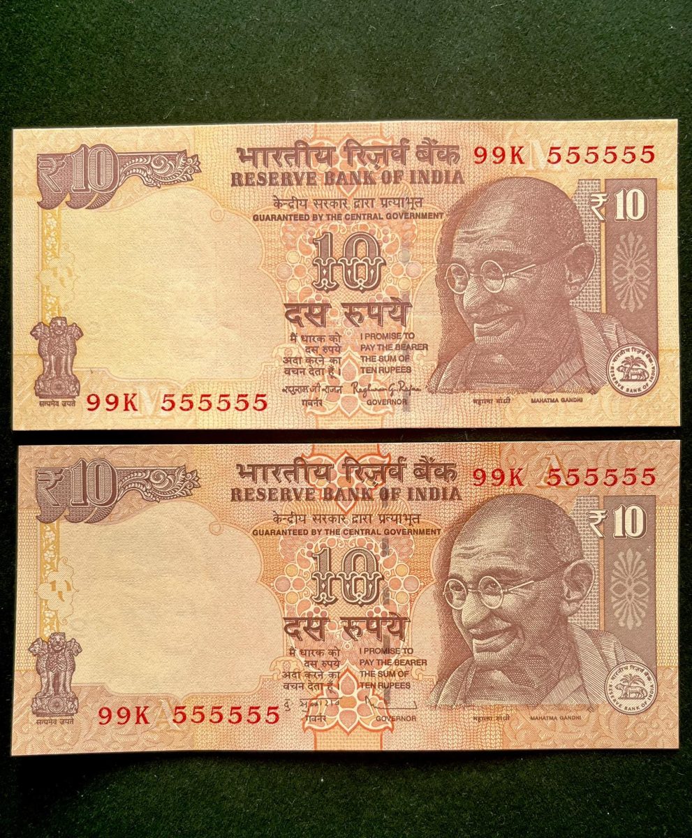Rs 10 India Banknote TWIN SET Gem Unc Very Unique Set Solid Number 99K 555555