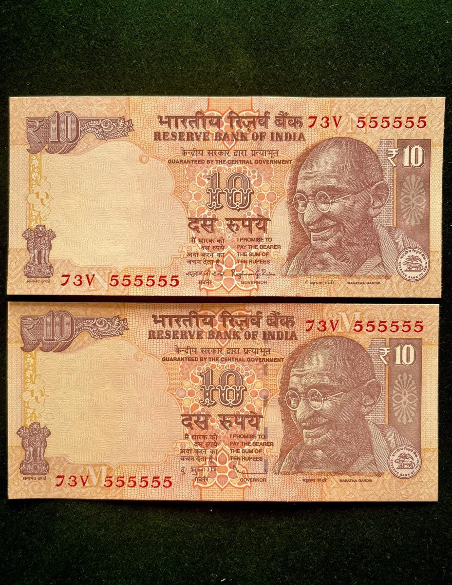 Rs 10 India Banknote TWIN SET Gem Unc Very Unique Set Solid Number 73V 555555