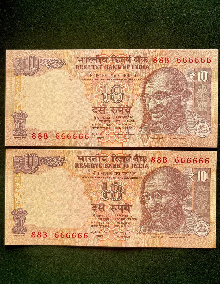 Rs 10 India Banknote TWIN SET Gem Unc Very Unique Set Solid Number 88B 666666