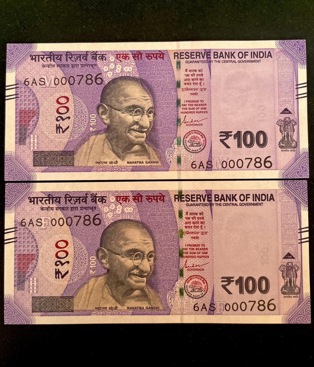 Rs 100 INDIA Banknote HOLY Number TWIN SET 6AS 000786