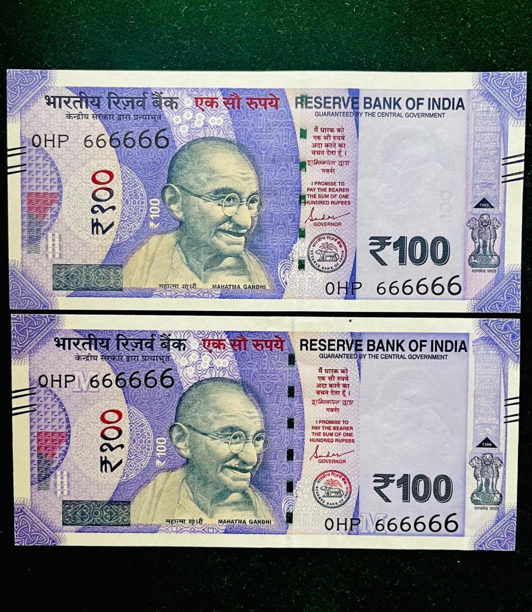 Rs 100 India Banknote TWIN SET Gem Unc Very Unique Solid Number 0HP 666666