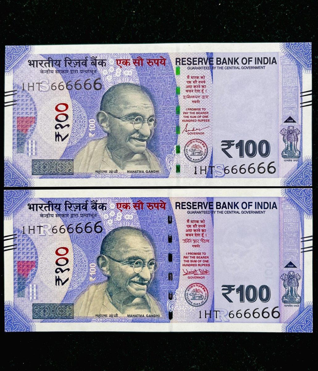 Rs 100 India Banknote TWIN SET Gem Unc Very Unique Solid Number 1HT 666666