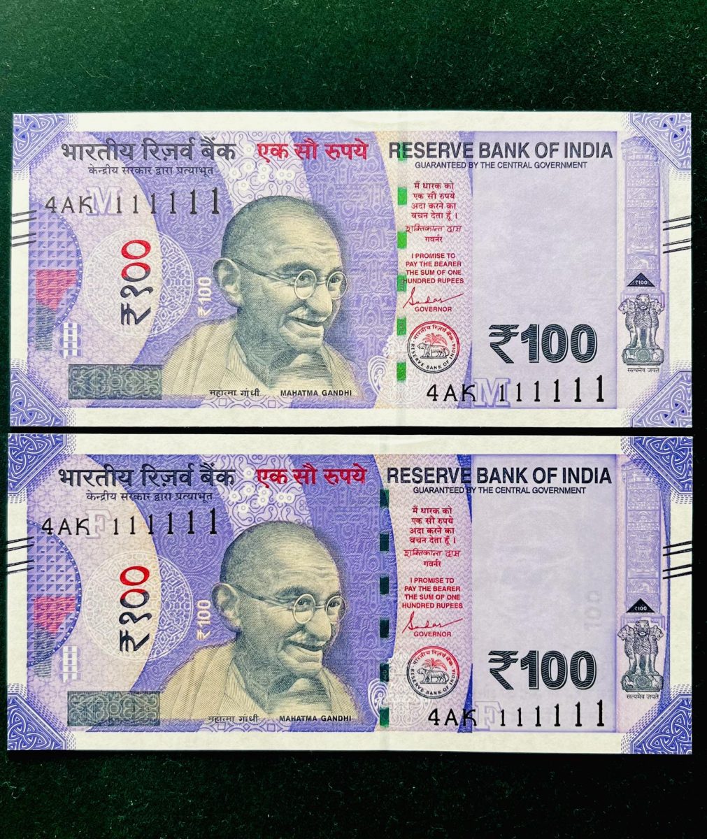 Rs 100 India Banknote TWIN SET Gem Unc Very Unique Solid Number 4AK 111111
