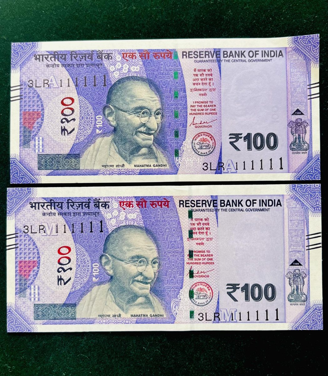 Rs 100 India Banknote TWIN SET Gem Unc Very Unique Solid Number 3LR 111111