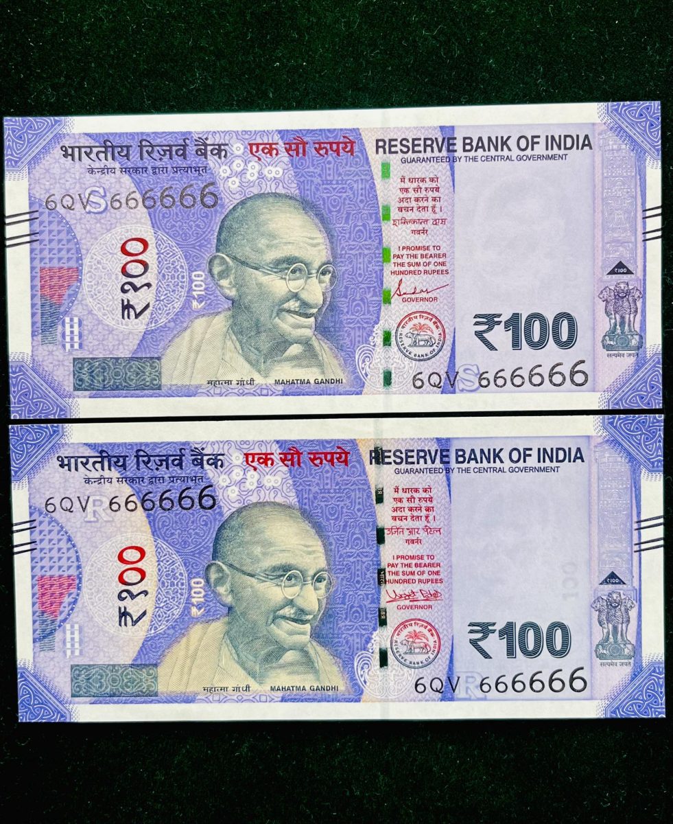 Rs 100 India Banknote TWIN SET Gem Unc Very Unique Solid Number 6QV 666666
