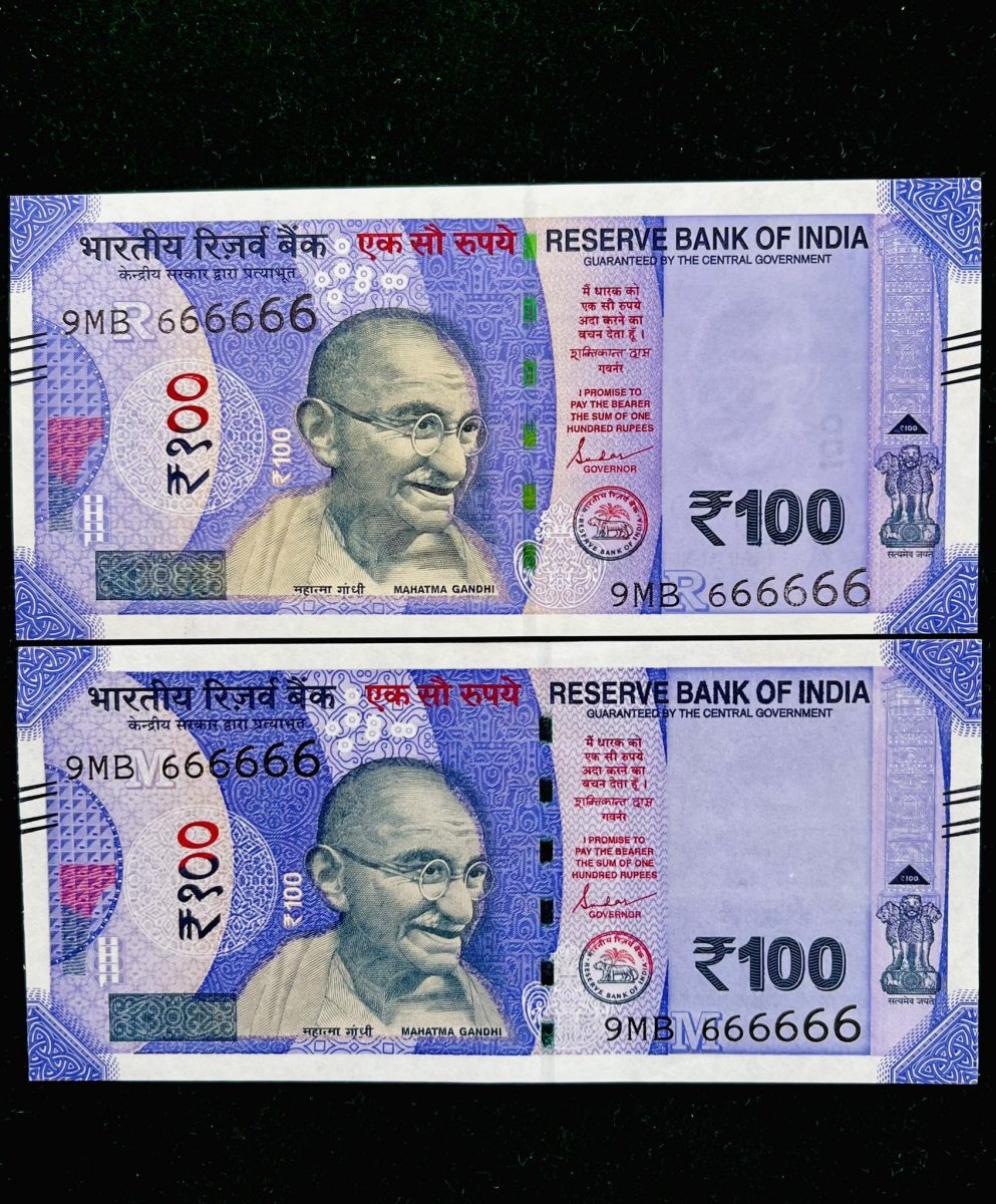 Rs 100 India Banknote TWIN SET Gem Unc Very Unique Solid Number 9MB 666666