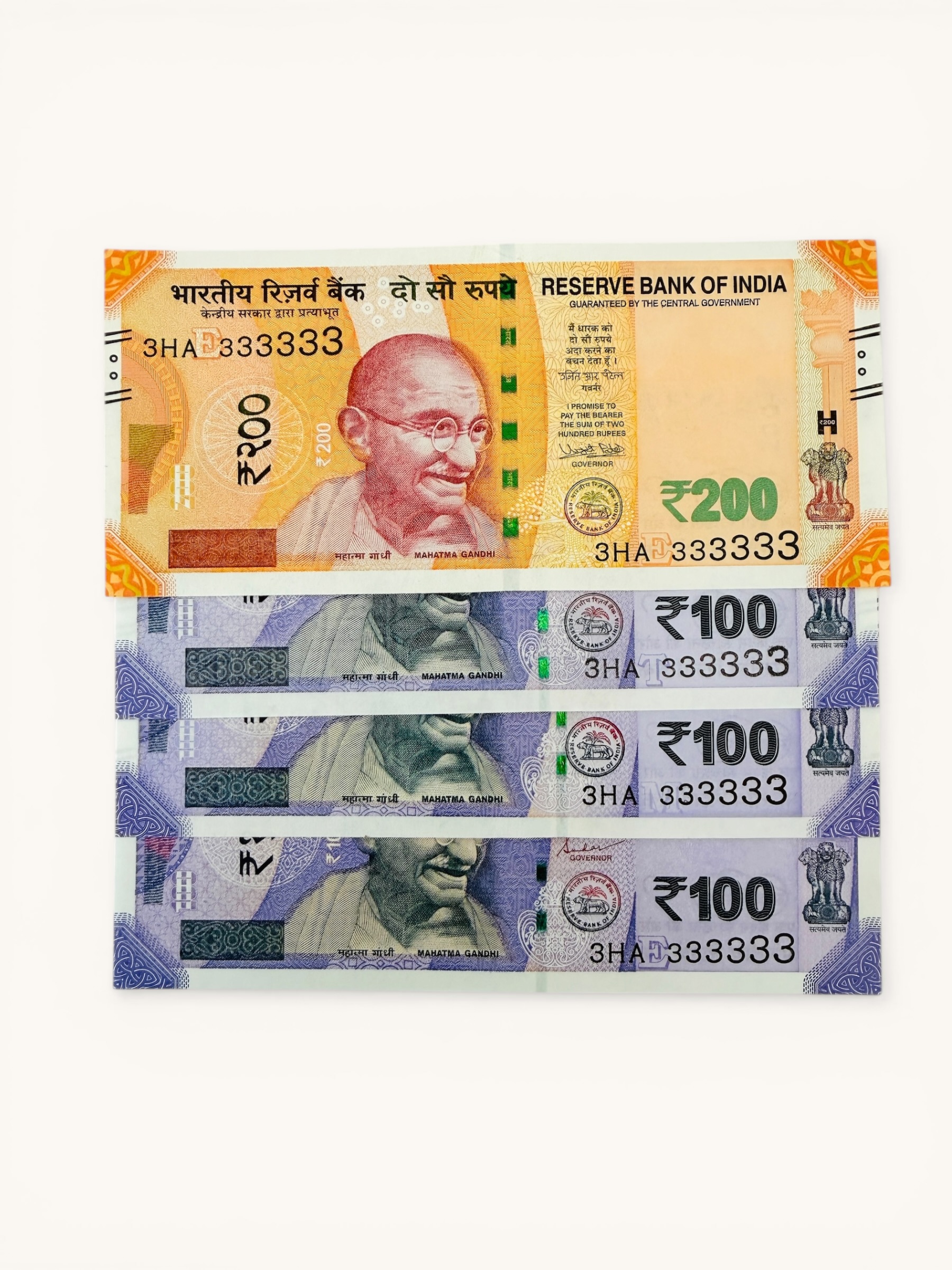 Rs 100 to 200 Ultra Unique Pair Set of Banknotes Same Number 3HA 333333 Gem UNC Unique and Rare