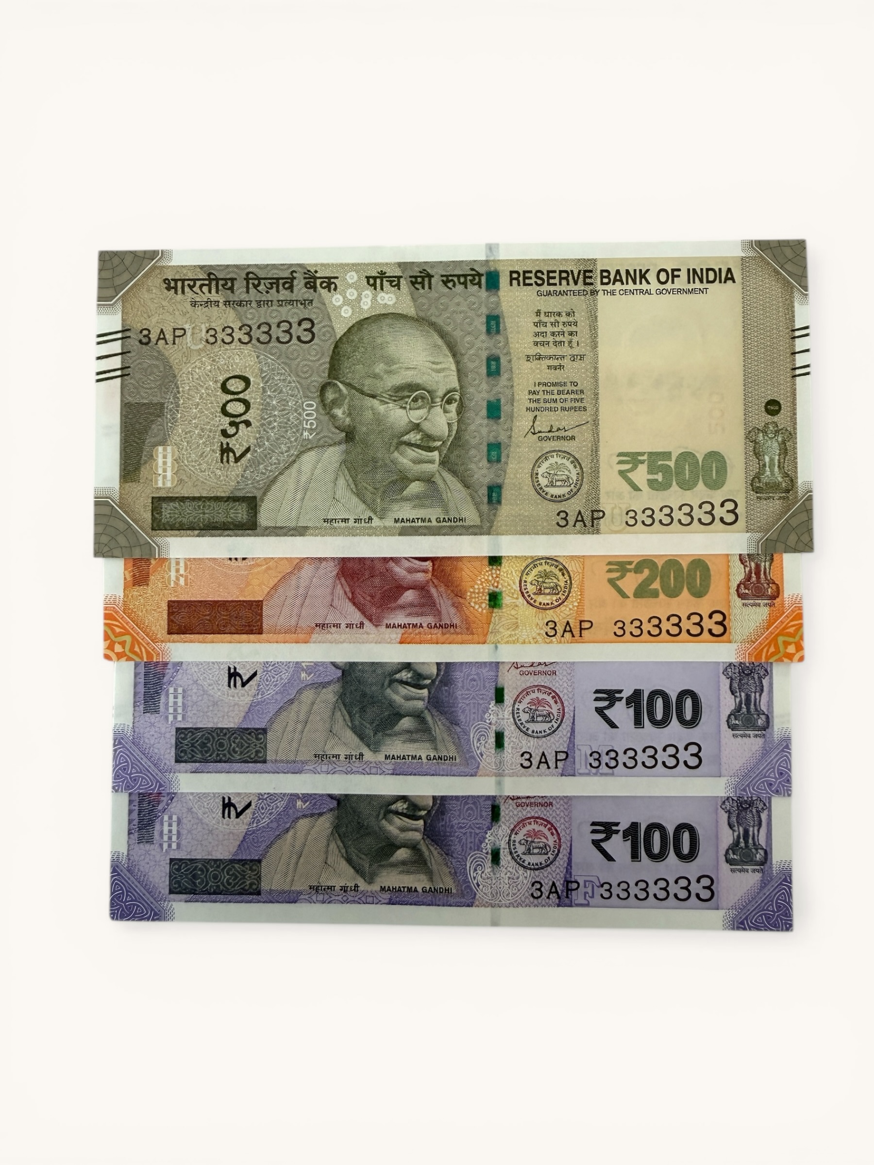 Rs 100 to 500 Ultra Unique Pair Set of Banknotes Same Number 3AP 333333 Gem UNC Unique and Rare