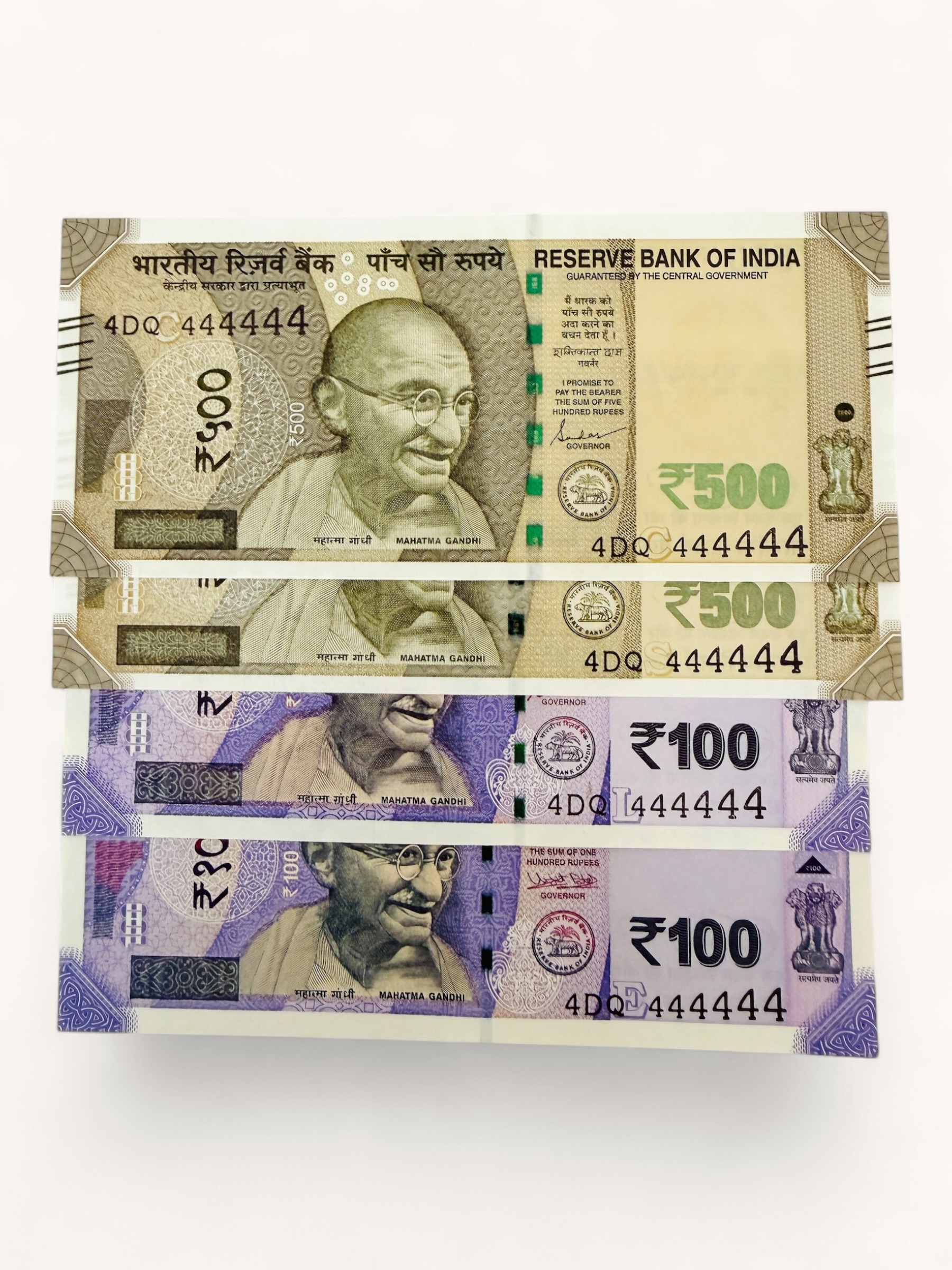 Rs 100 to 500 Ultra Unique Pair Set of Banknotes Same Number 4DQ 444444 Gem UNC Unique and Rare