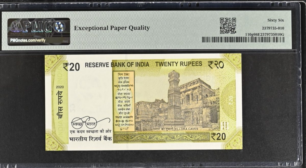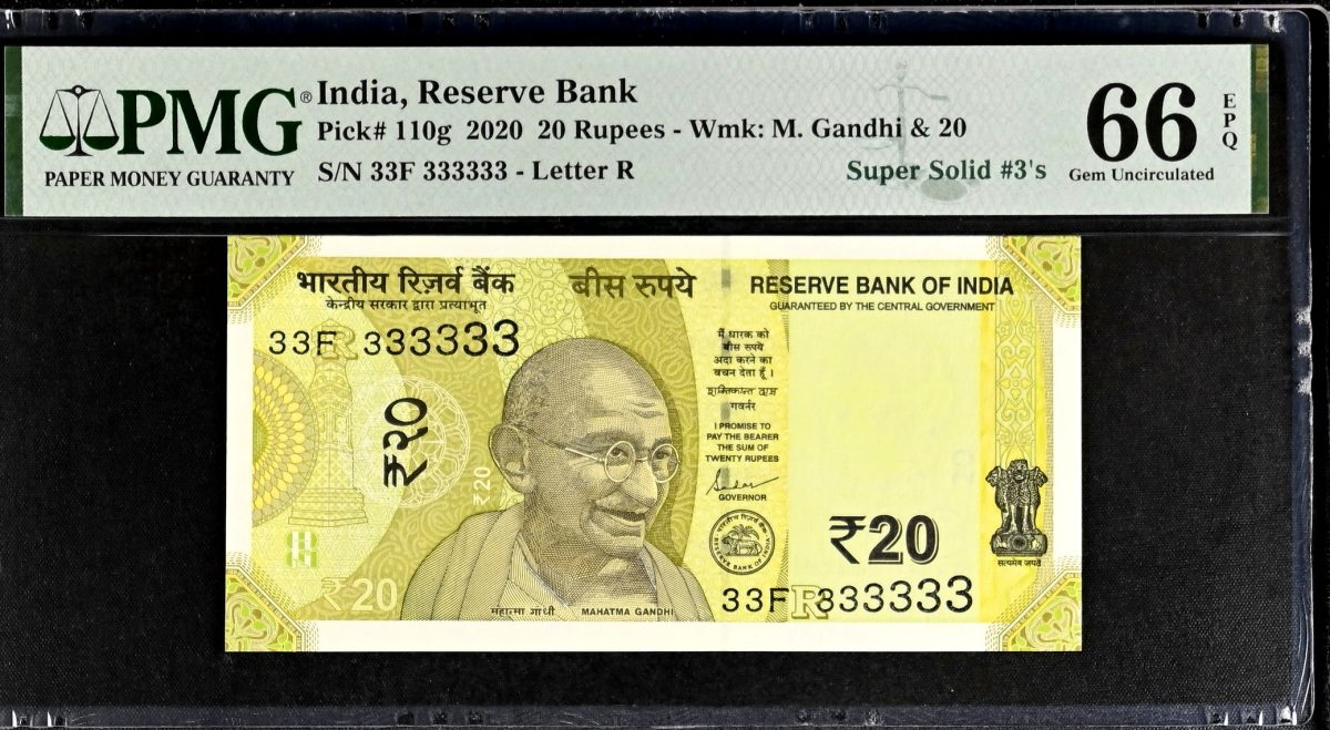 Immerse yourself in the rich history of Indian currency with this exquisite Rs 20 India Banknote issued in 2020 by the Reserve Bank. Graded an impressive PMG 66 EPQ, this note bears the signature of Shaktikant Das, adding a unique touch to this rare collectible. The note features a fascinating serial number 33F 333333, making it even more special for enthusiasts. With a watermark depicting M. Gandhi and the number 20, this banknote is a true gem for any collector. The exceptional paper quality and pedigree as a ‘Super Solid #3’S’ further enhance its allure. Perfect for both seasoned collectors and newcomers, this banknote offers a glimpse into India’s economic history and is a prized addition to any collection.