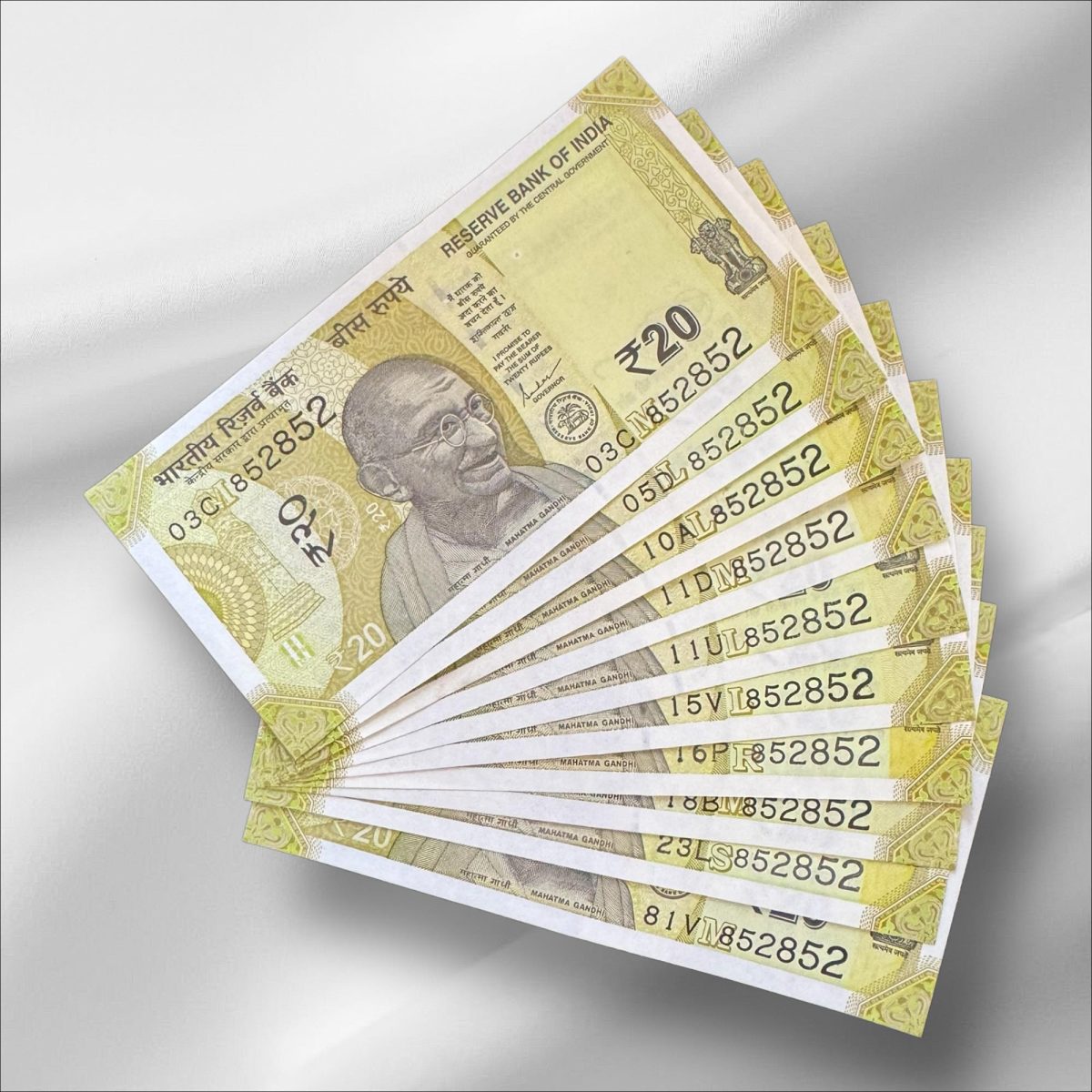RS 20/- India Banknote Latest Issue Number Repeater 852852 x 10 GEM UNC Unique and Rare