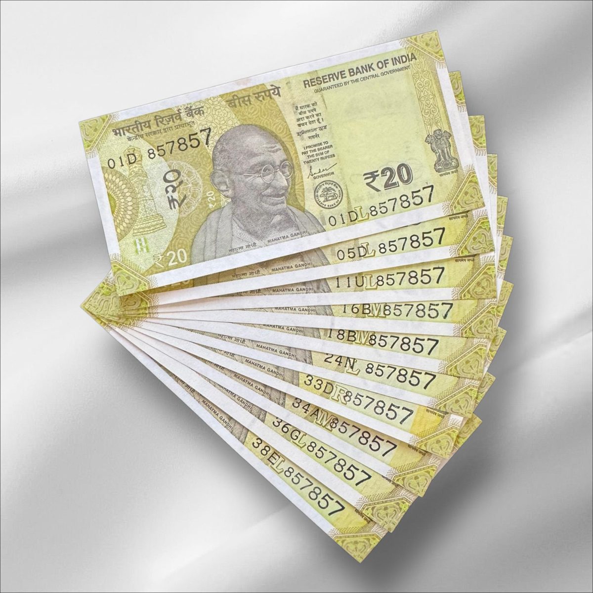 RS 20/- India Banknote Latest Issue Number Repeater 857857 x 10 GEM UNC Unique and Rare