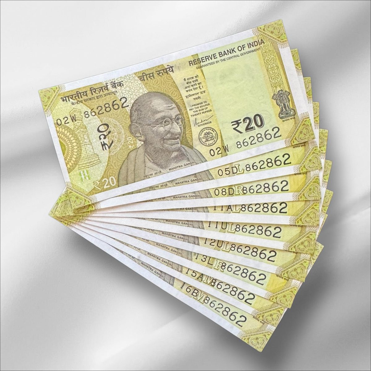 RS 20/- India Banknote Latest Issue Number Repeater 862862 x 10 GEM UNC Unique and Rare