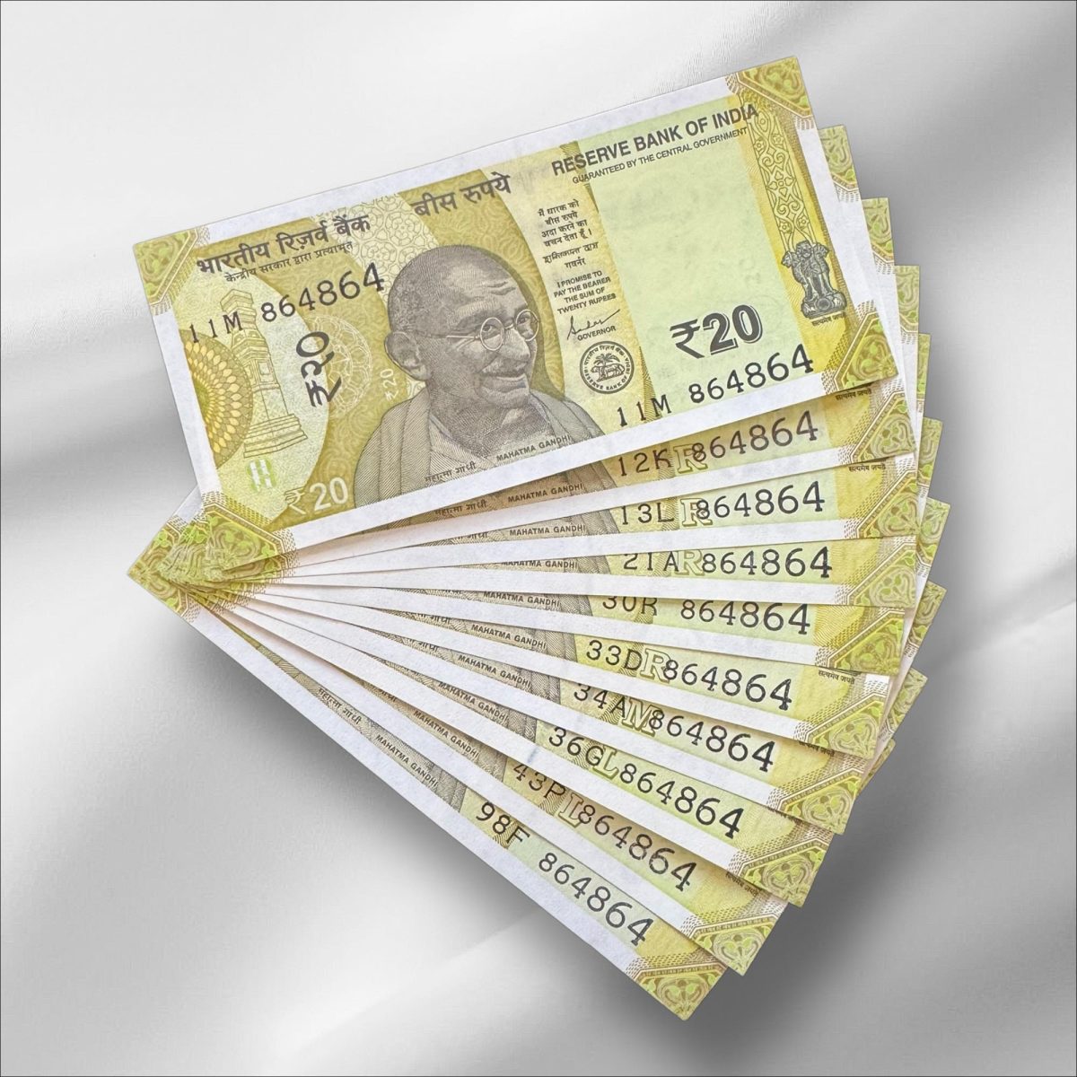 RS 20/- India Banknote Latest Issue Number Repeater 864864 x 10 GEM UNC Unique and Rare