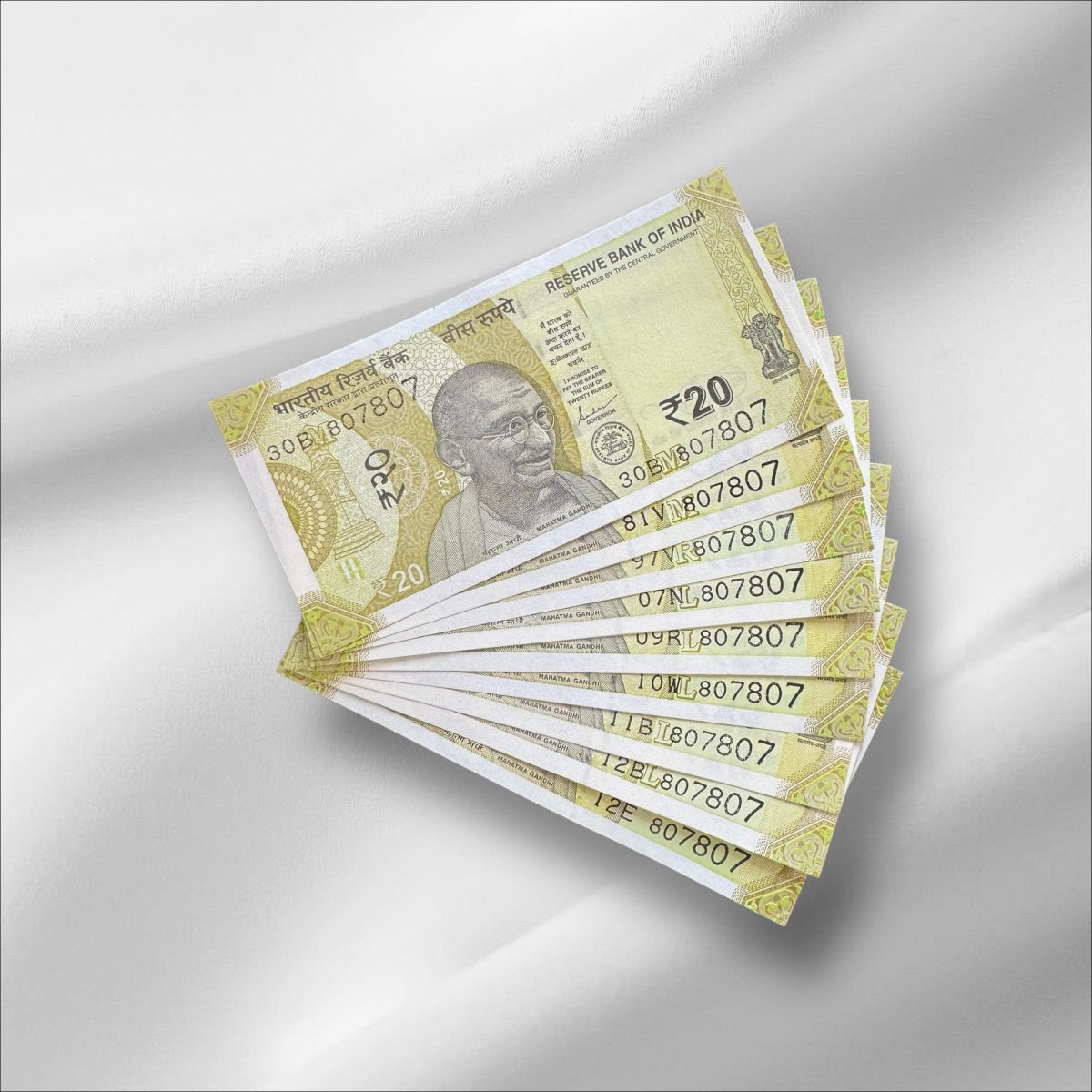 Rs 20/- India Banknote Same NUMBER 807807 x 10 NOTES Latest Issue Unique and Rare