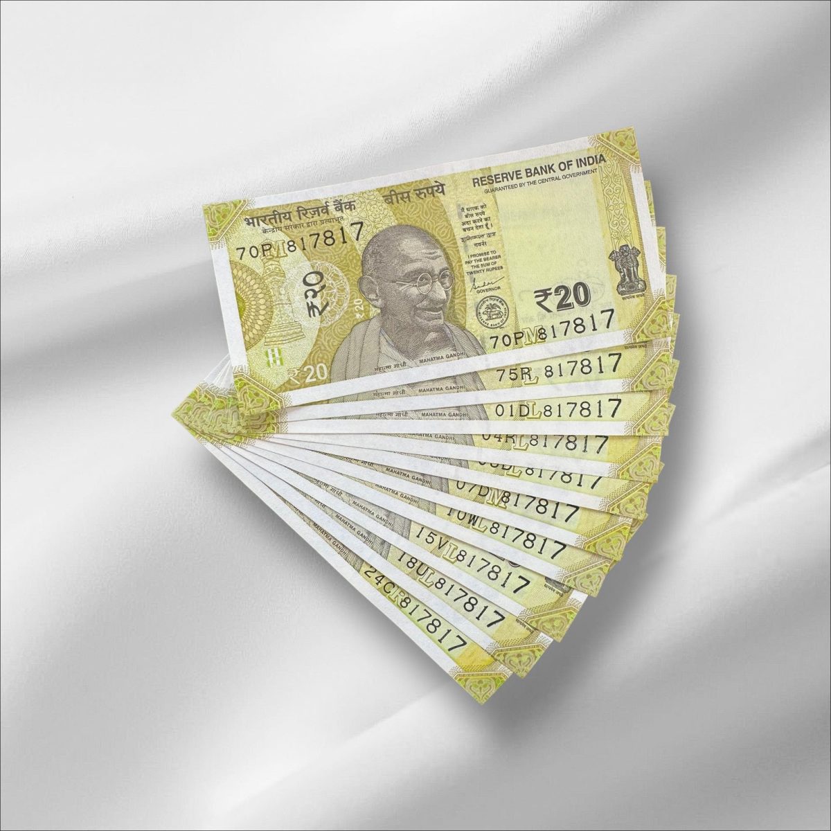 Rs 20/- India Banknote Same NUMBER 817817 * 10 NOTES Latest Issue Unique and Rare