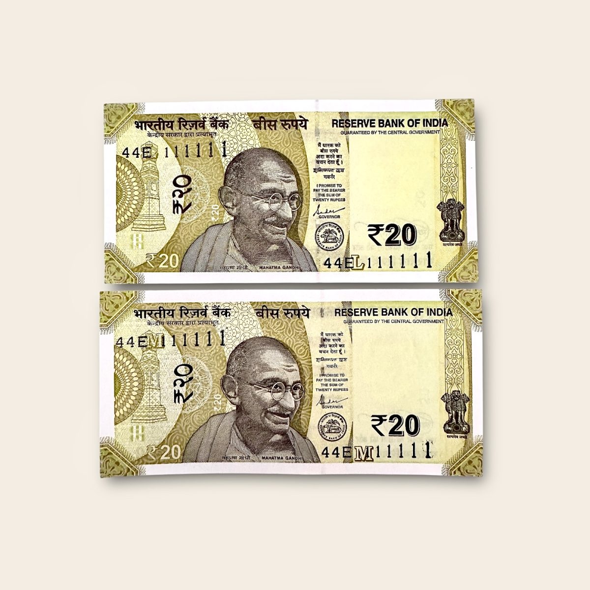 Rs 20 India Banknote Twin Pair Set 44E 111111 Gem UNC Unique and Rare