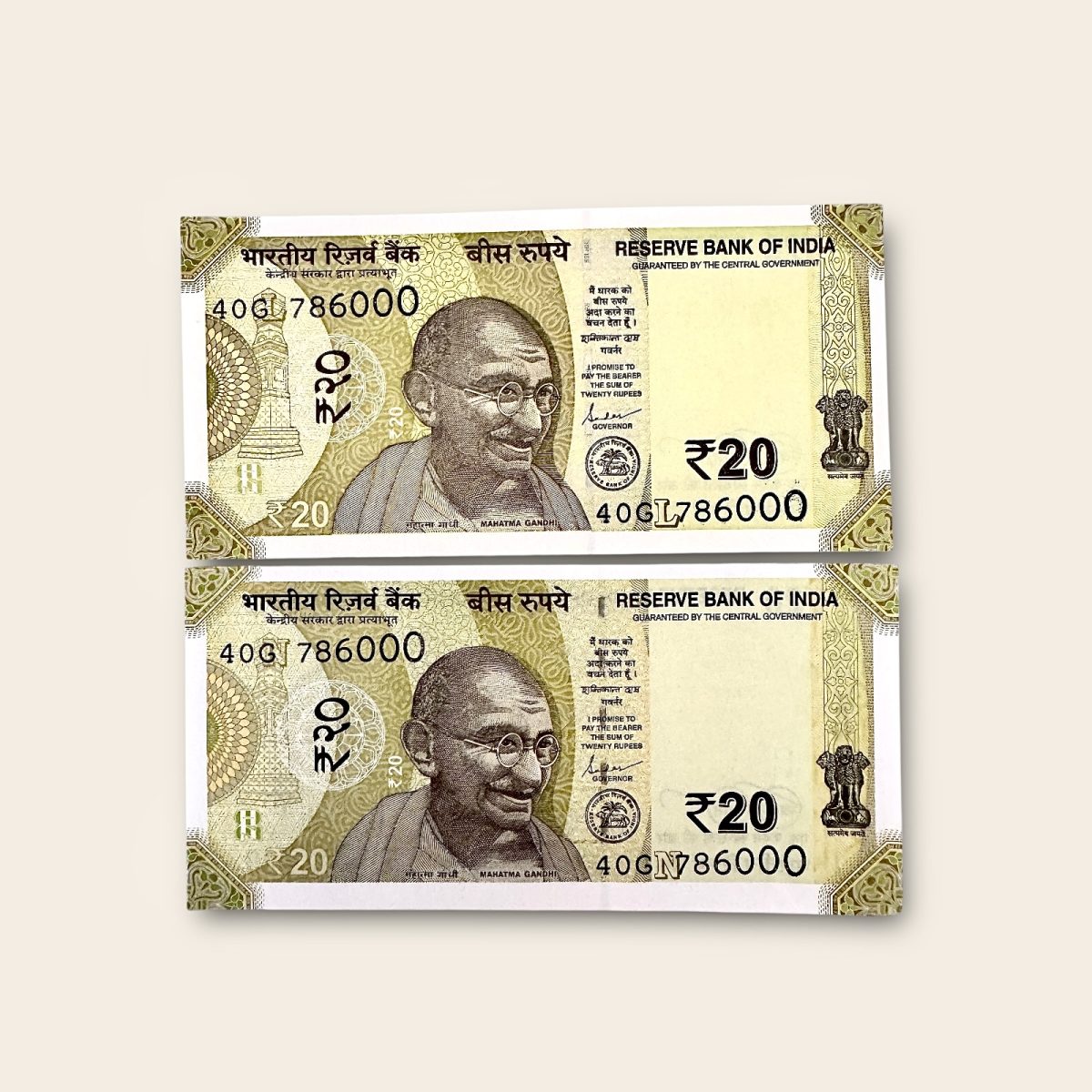 Rs 20 India Banknote Twin Pair Set GEM UNC 40G 786000 Unique and Rare