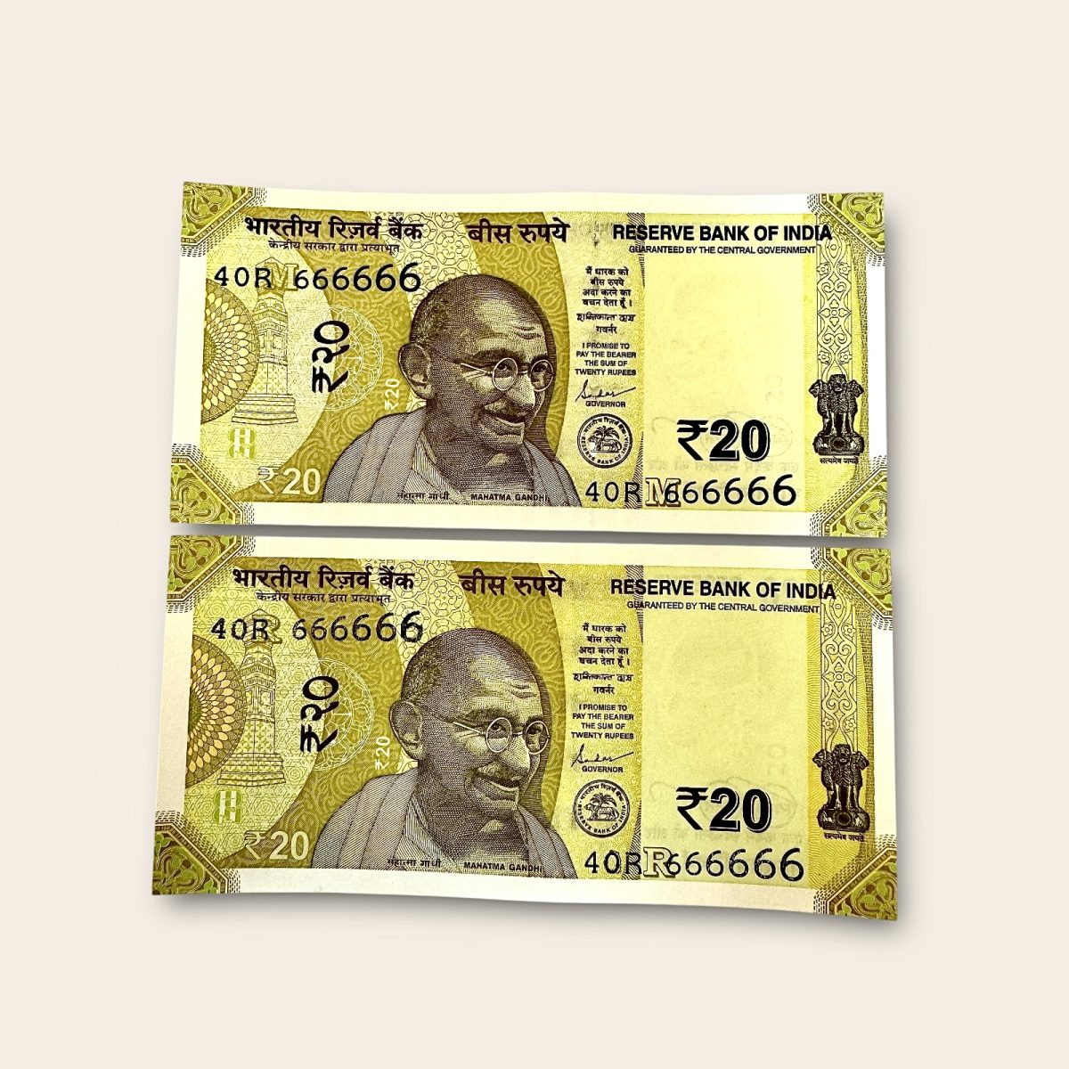 Rs 20 India Banknote Twin Pair Set GEM UNC 40R 666666 Unique and Rare