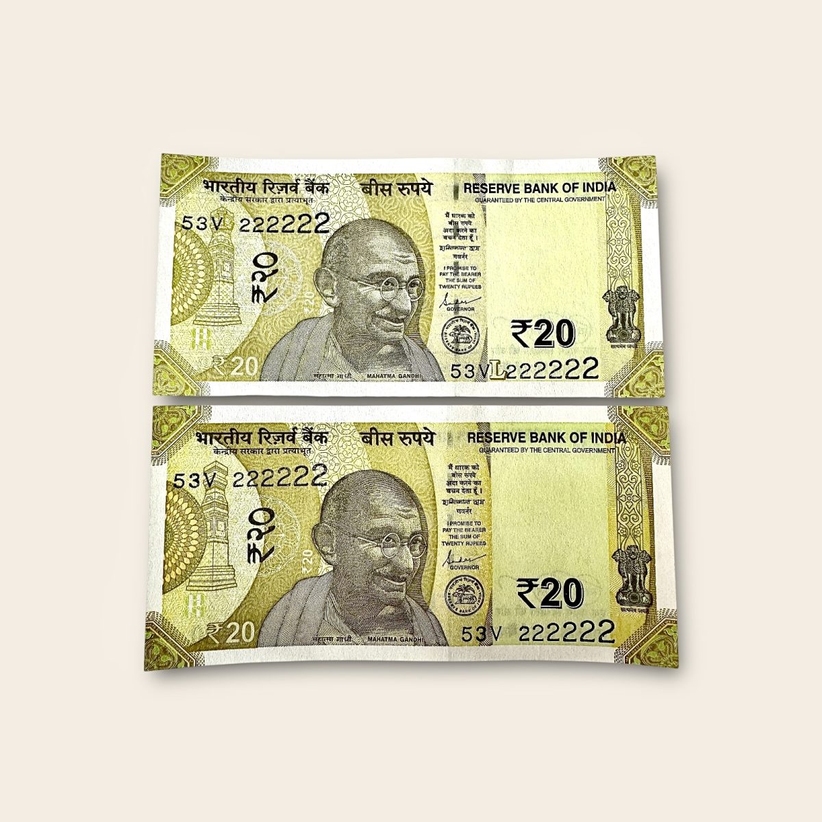 Rs 20 India Banknote Twin Pair Set GEM UNC 53V 222222 Unique and Rare