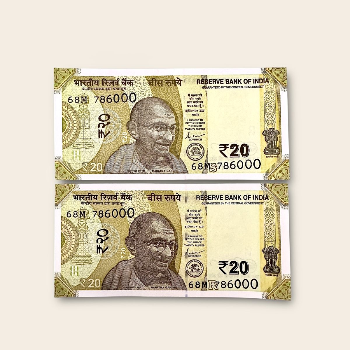 Rs 20 India Banknote Twin Pair Set GEM UNC 68M 786000 Unique and Rare