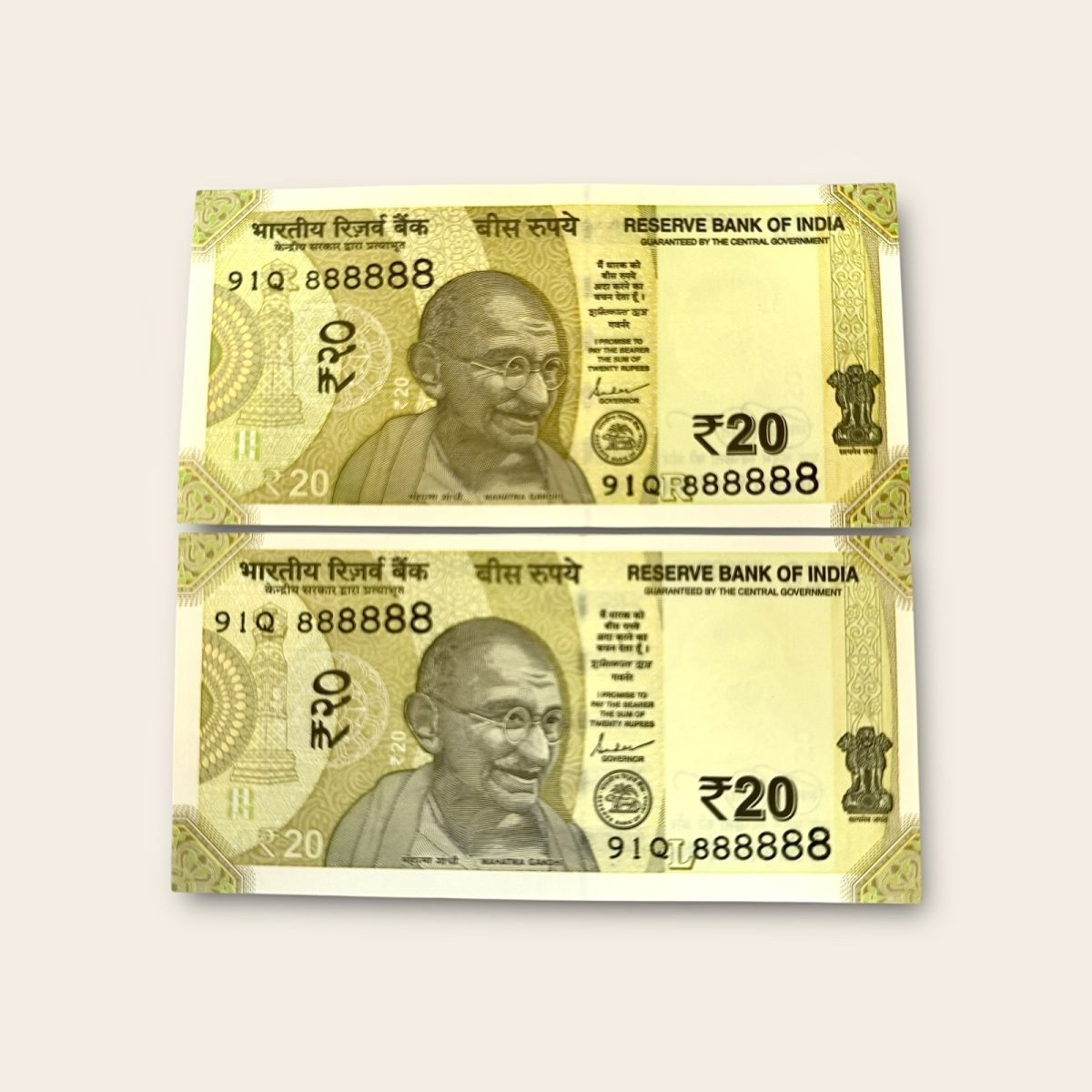 Rs 20 India Banknote Twin Pair Set GEM UNC 91Q 888888 Unique and Rare