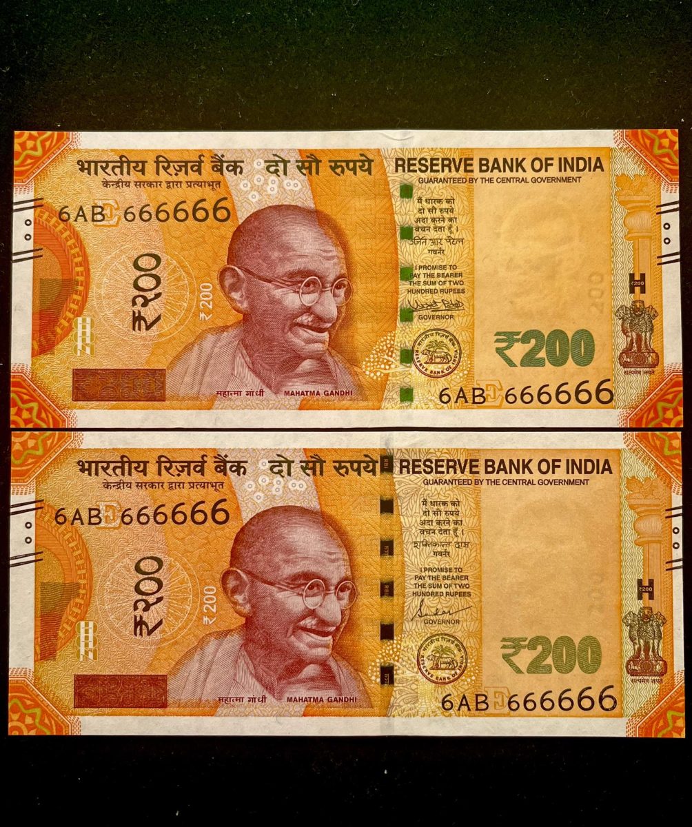 Rs 200 India Banknote Twin Set Super Solid 6AB 666666 Gem Unc Unique and Rare