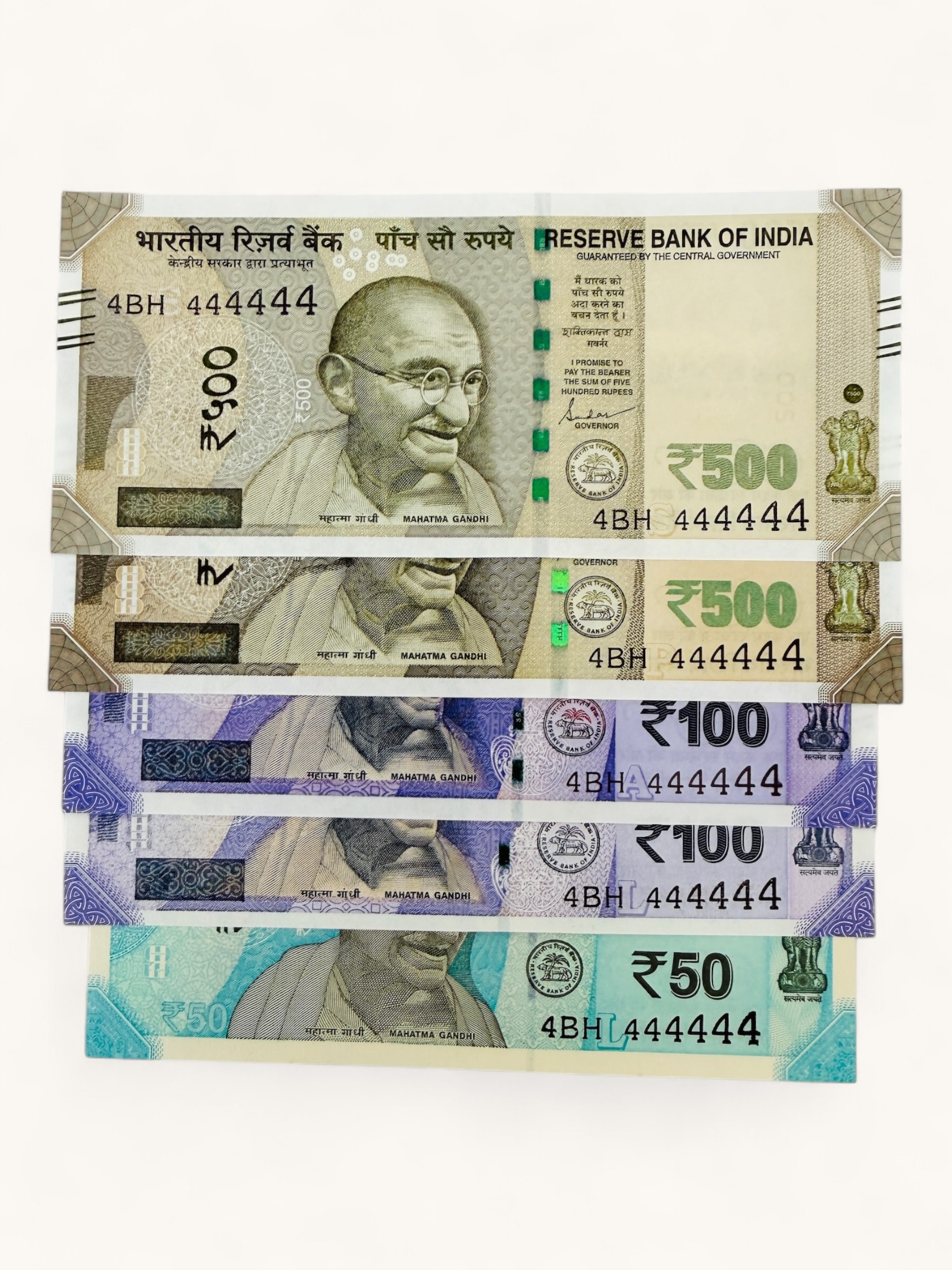 Rs 50 to 500 Ultra Unique Pair Set of Banknotes Same Number 4BH 444444 Gem UNC Unique and Rare