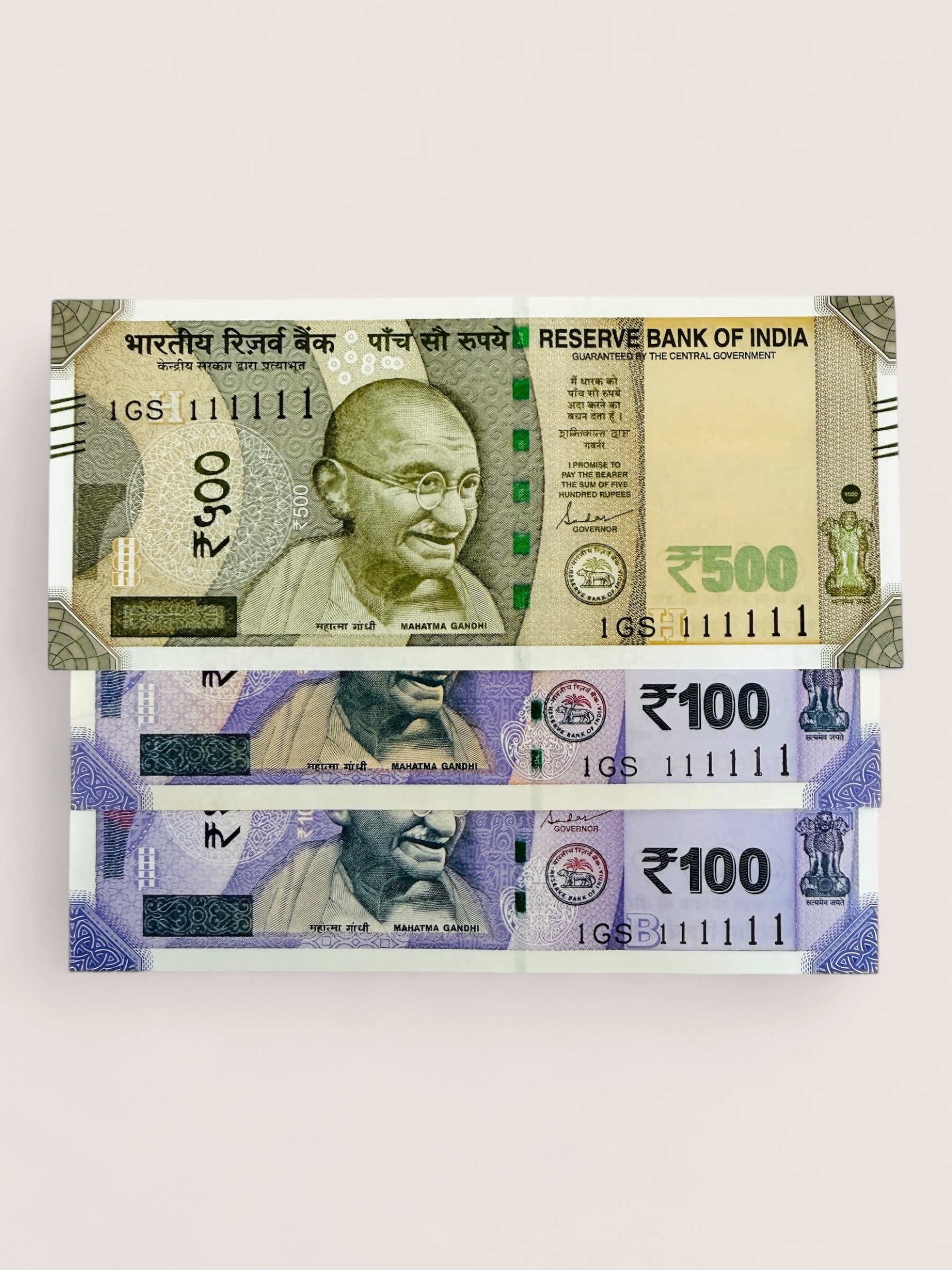 Rs 500 and 100 Ultra Unique Pair Set of Banknotes Same Number 1GS 111111 Gem UNC Unique and Rare