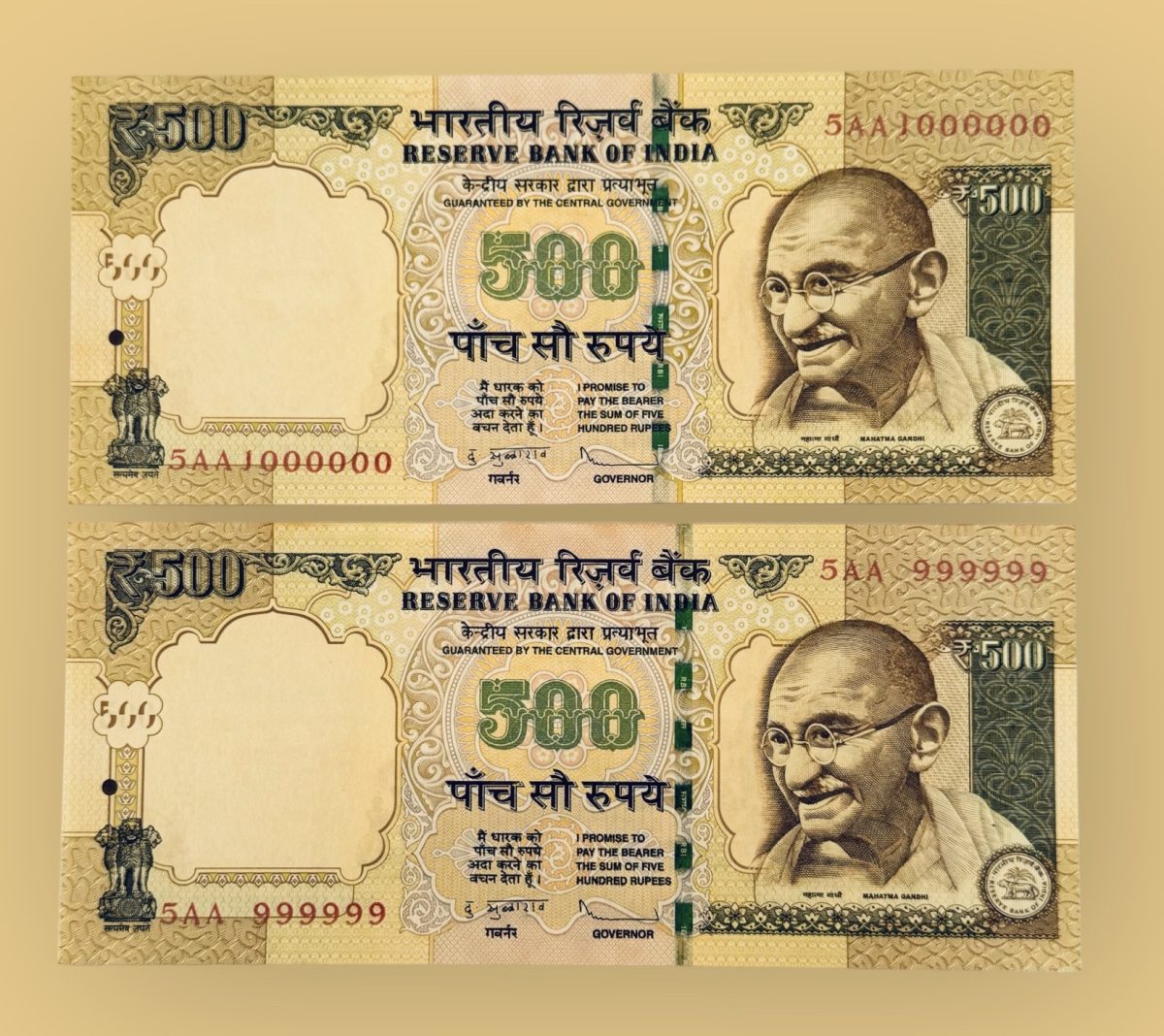 Rs 500 India Banknote Previous Rare Issue 999999 and 1000000 Gem Unc Unique and Rare