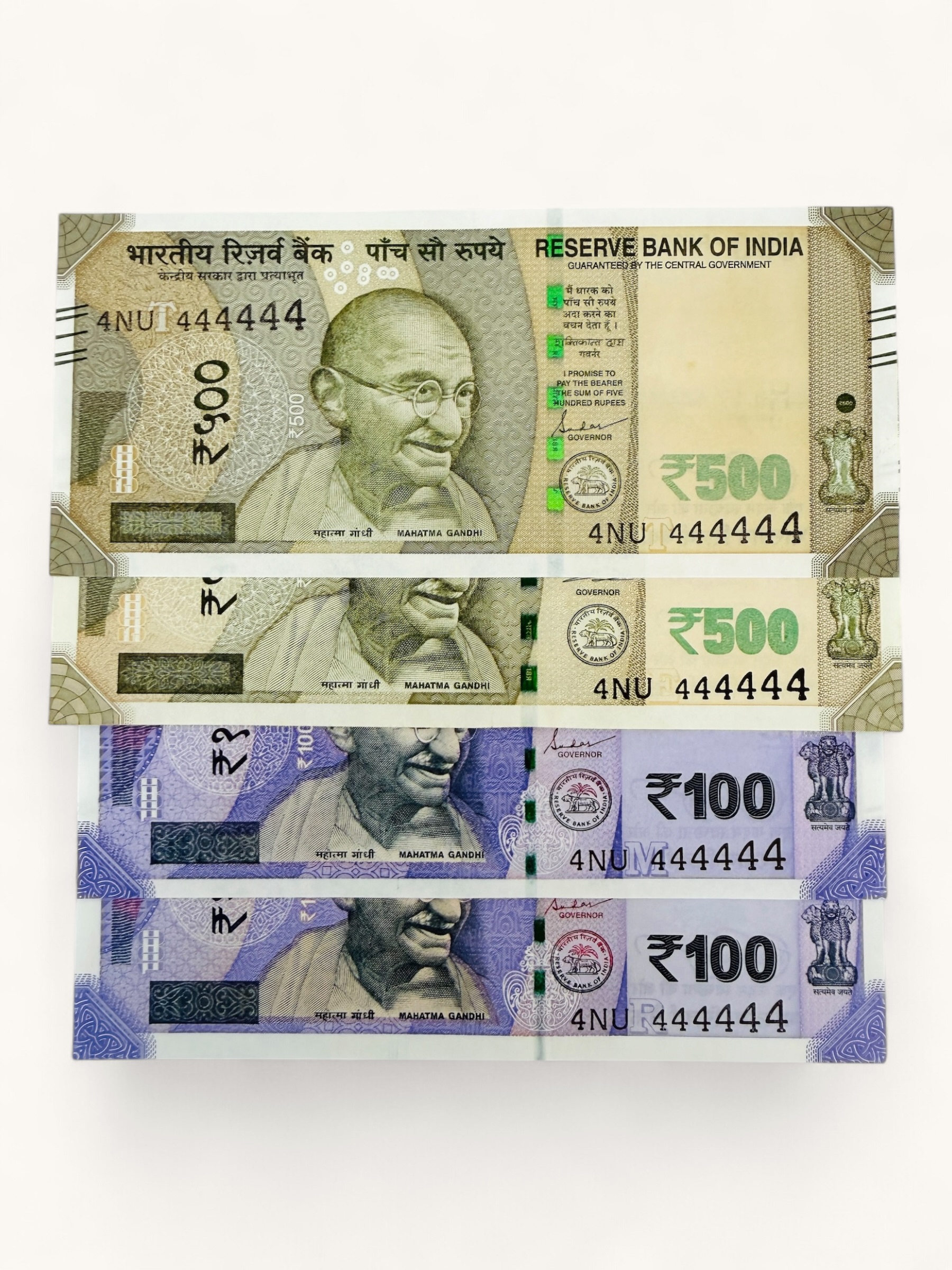 Rs 500 to 100 Ultra Unique Pair Set of Banknotes Same Number 4NU 444444 Gem UNC Unique and Rare