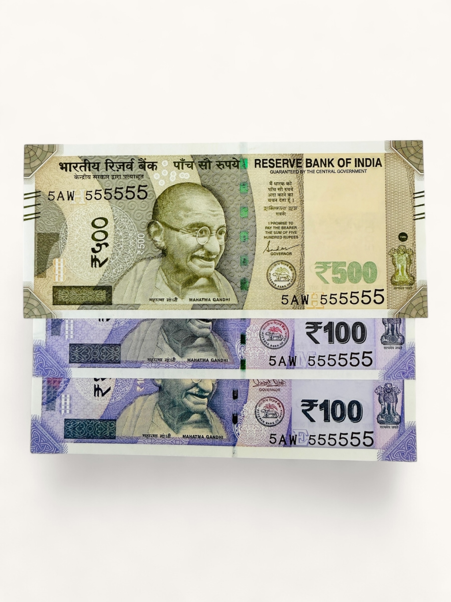 Rs 500 to 100 Ultra Unique Pair Set of Banknotes Same Number 5AW 555555 Gem UNC Unique and Rare
