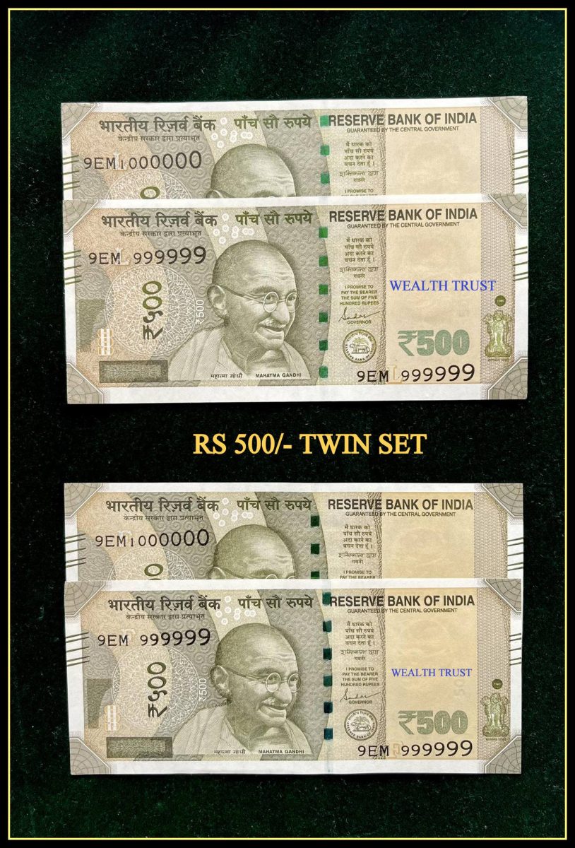 Immerse yourself in the rich tapestry of India’s economic history with this exquisite collectible set of two Rs 500 banknotes. Issued in UNC (new) condition, this Twin Pair Gem Unc Banknote Set features the solid number 9EM 999999 & 1 MILLION, making it a truly unique addition to any collector’s treasury. These banknotes, denominated at 500 Rupees, bear the same number, prefix, and denomination, adding to their allure as a rare find for enthusiasts.