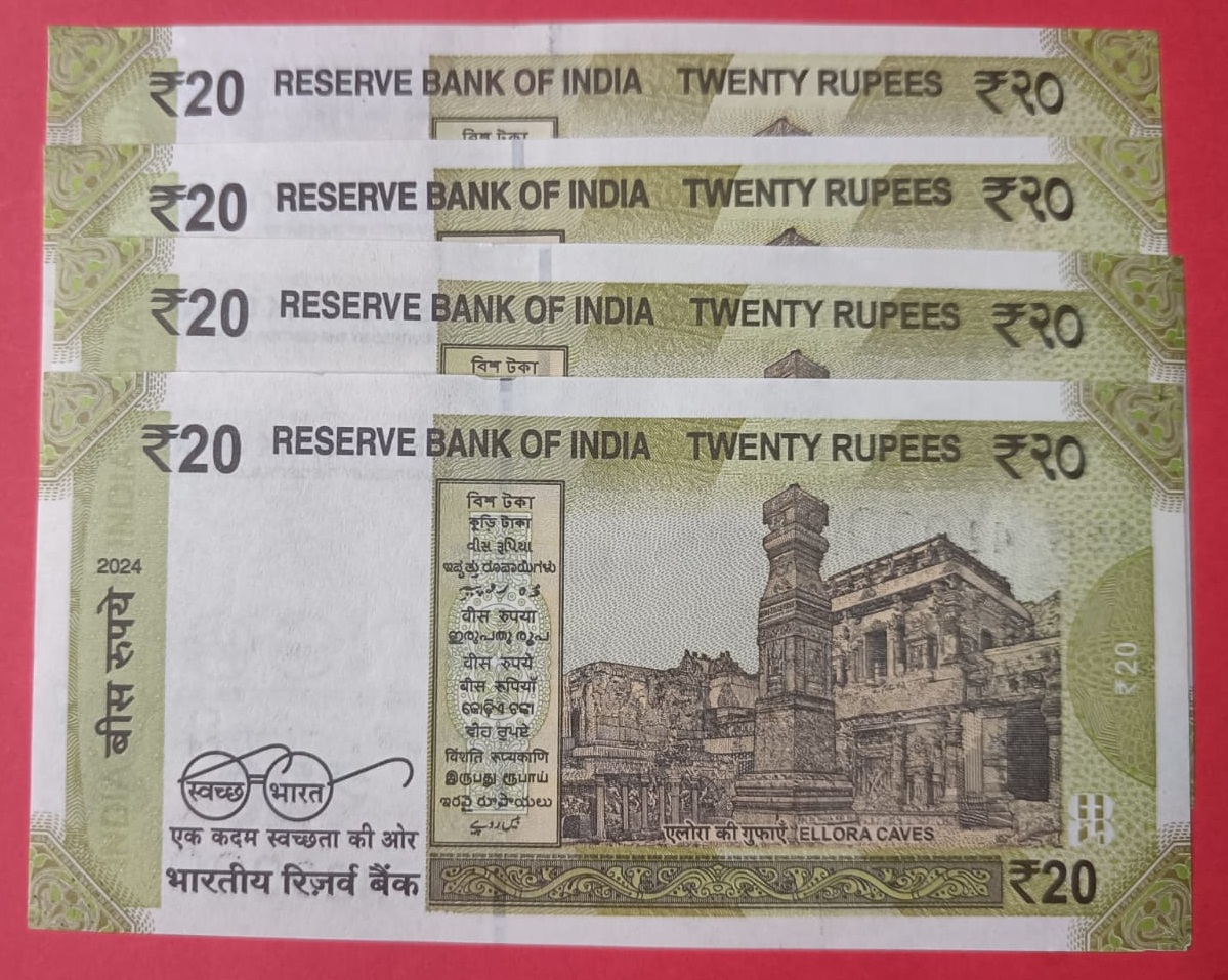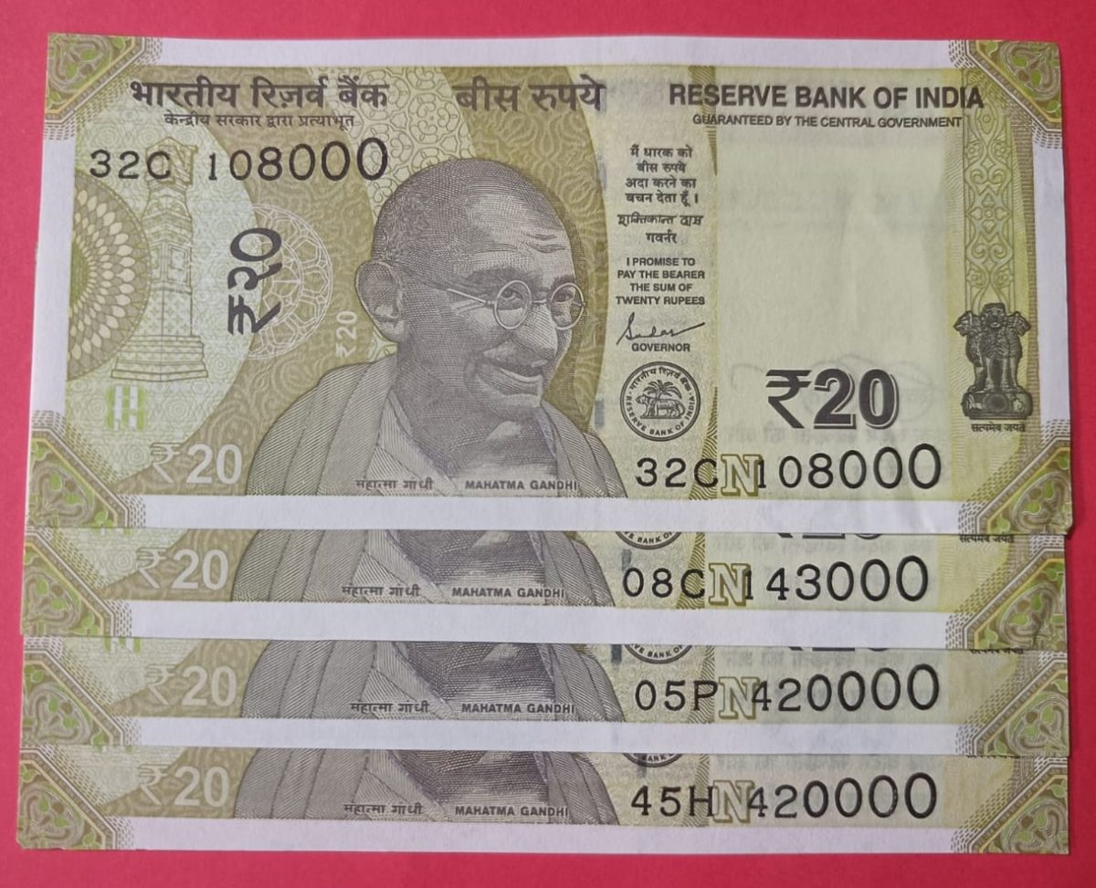 20 Rs Super Fancy Number Set of 4 Notes. 108000, 143000 and 420000. Condition GEM UNC. Set of 4 Notes Collectors Item