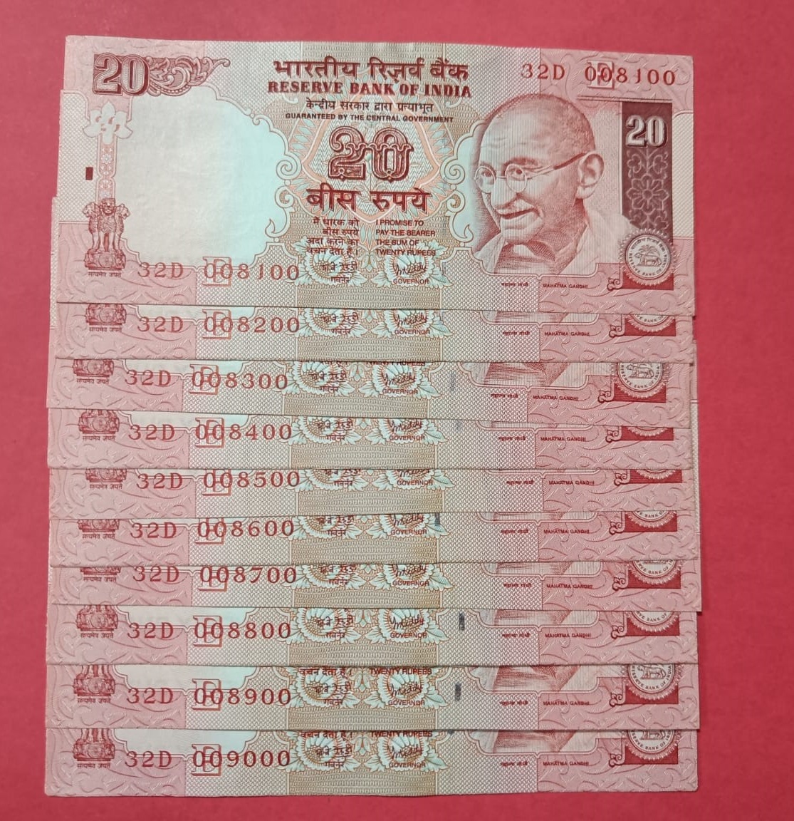 20 Rs Y V Reddy GEM UNC Set Lower Serial Starting and ending with 100 and Same Prefix