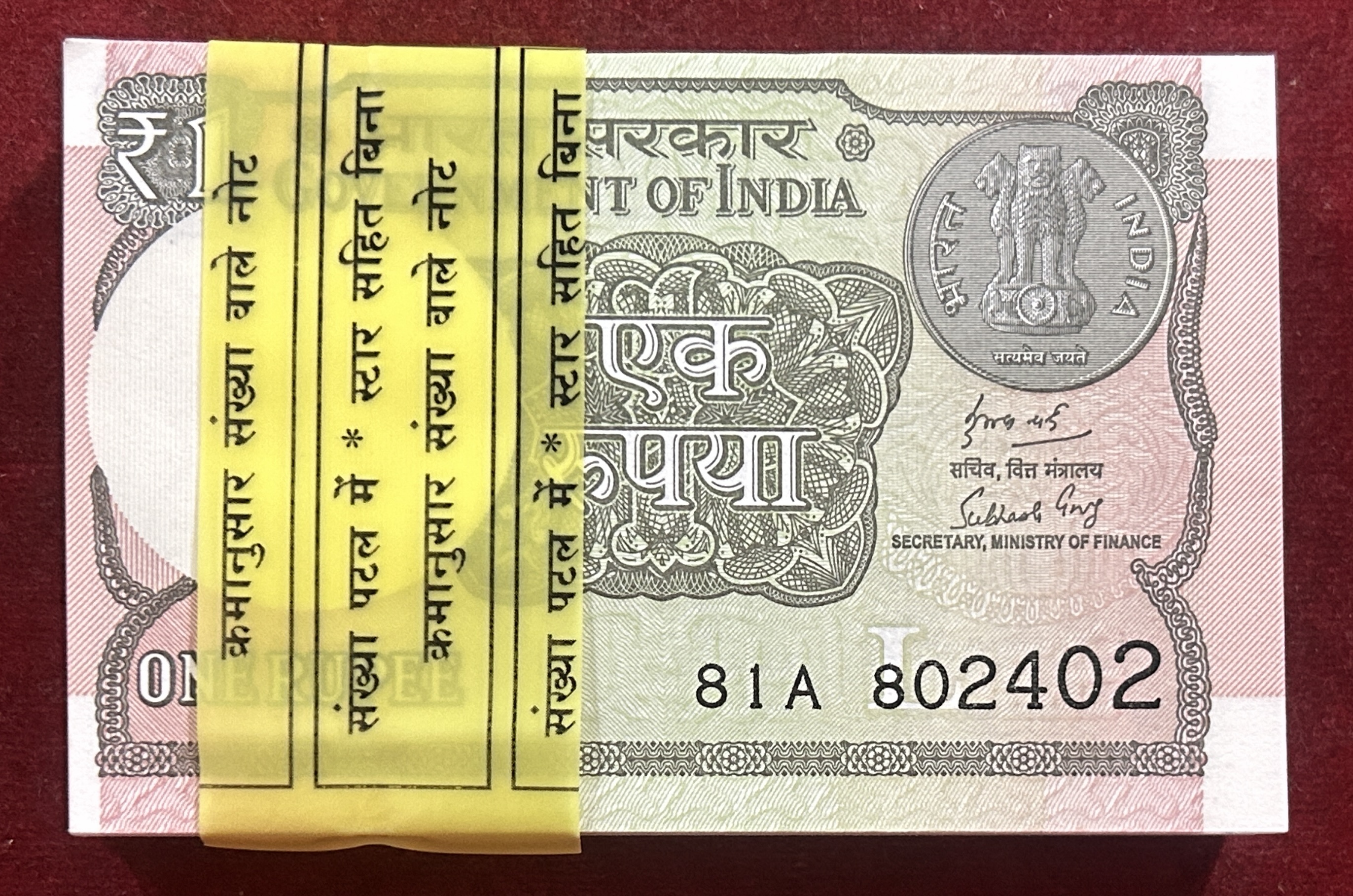 Step into the world of numismatics with this exceptional 2018 one rupee packet containing 99 regular notes and a single star note ⭐. Issued by the Reserve Bank of India, this packet is a true rarity and a prized addition to any collector’s treasure trove. The star note features a special serial number and stands out as a unique piece in this set.