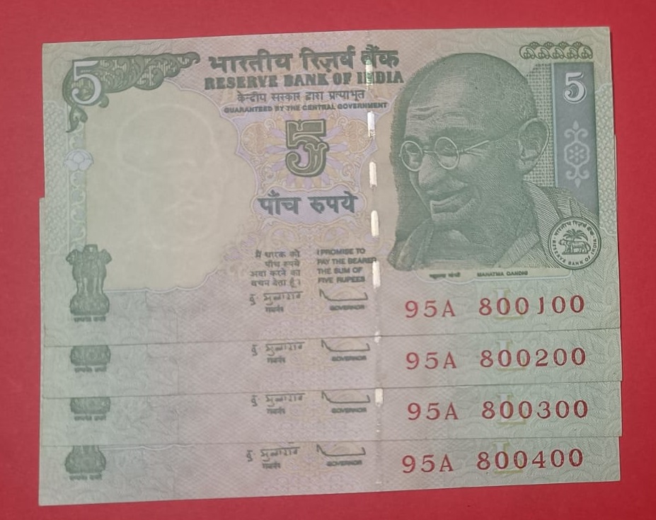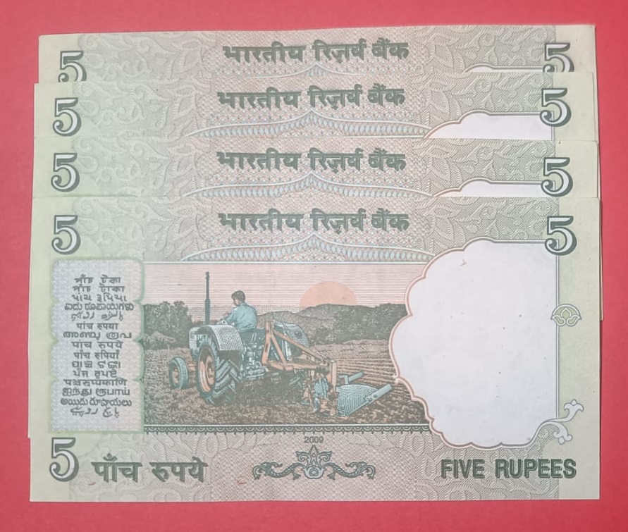 5 Rs Tractor issue Fancy Number Set of 4 Notes Same Prefix GEM UNC Condition