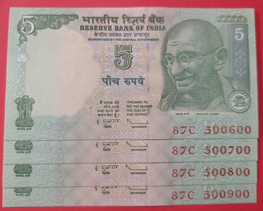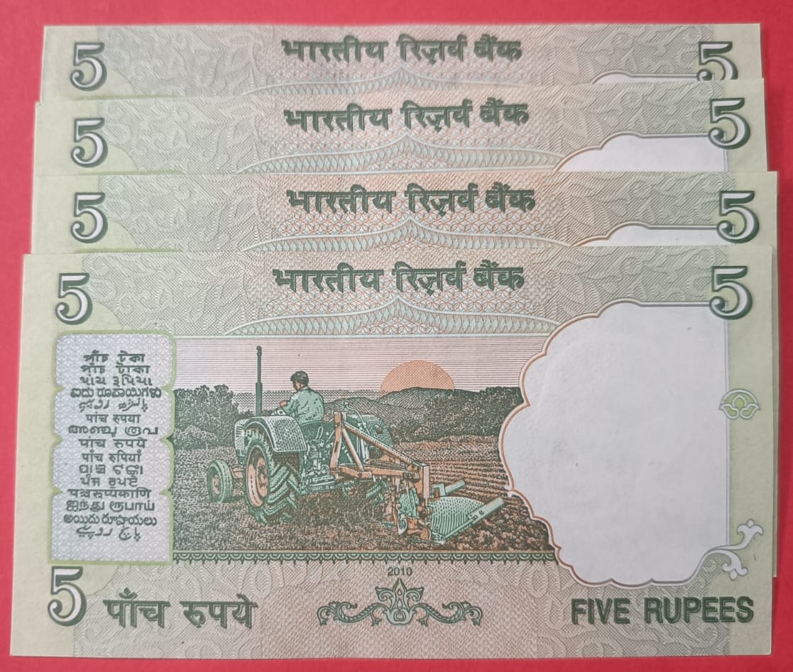 5 Rs Tractor issue Fancy Number Set of 4 Notes Same Prefix GEM UNC Condition