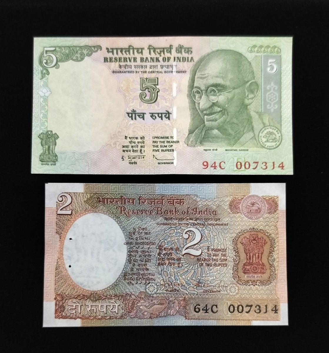 5 Rupee 2 Rupee Fancy JAMES BOND JODI NO 007314 UNC