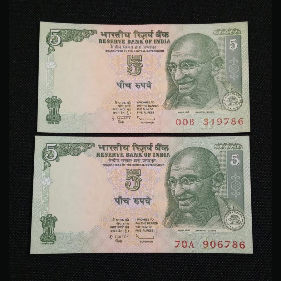 5 Rupees Gandhi Series Signature D.SUBBARAO with “00 Prefix” and Ending 786 FANCY Numbers RARE Crisp UNC Conditions.