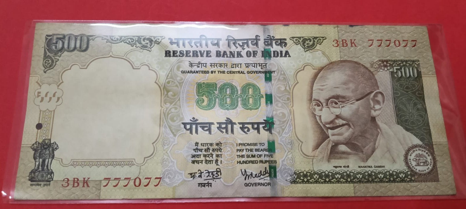 The rarity of this note is accentuated by its sequential fancy number, 770777, which adds an extra layer of allure for collectors and enthusiasts alike. The 500 Rupee denomination, introduced in recent years, reflects India’s commitment to modernizing its currency while preserving its rich heritage.