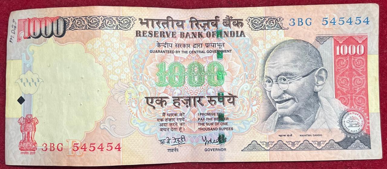 545454 TRIPLING FANCY NUMBER 1000 RUPEES GOVERNOR Y.B REDDY (R INSERT 2006) RARE NOTE