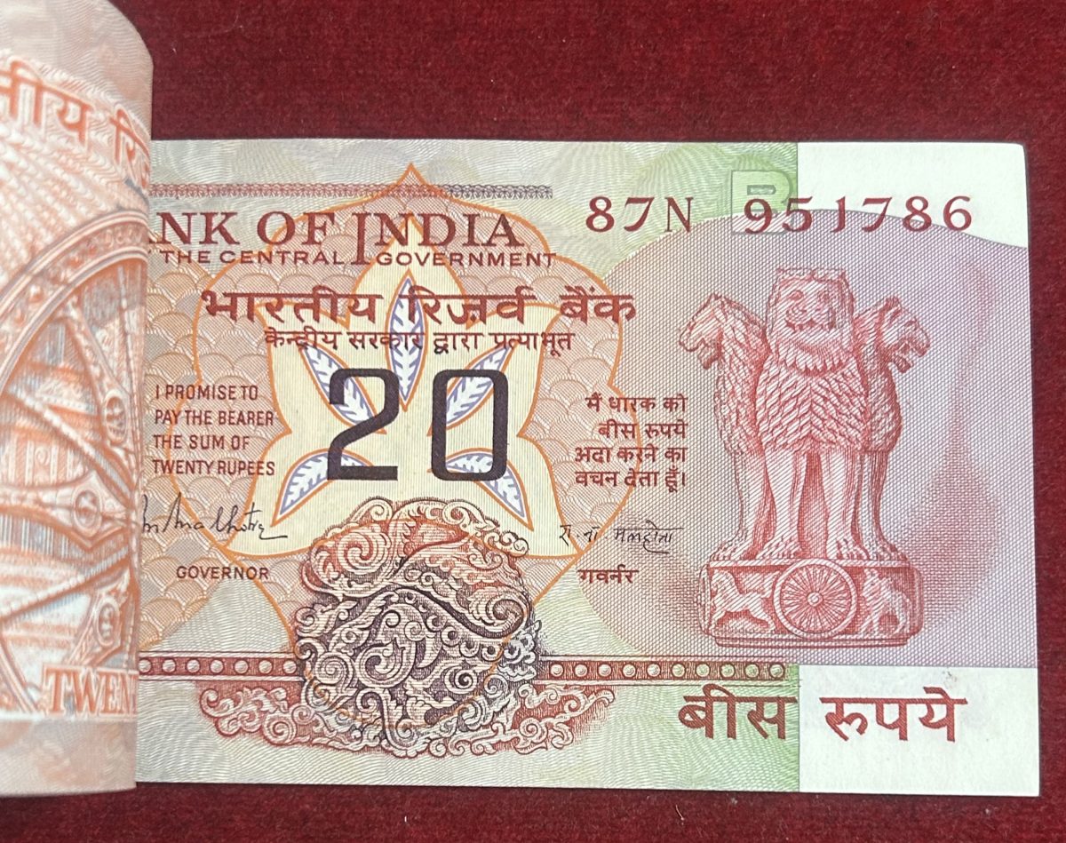 Immerse yourself in the charm of numismatic history with the 786 Fancy Number R.N. Malhotra 20 Rupees Old Issue 100 Note Serial Fancy Packet. This collectible gem features a 20 Rupee denomination and originates from the era when R.N. Malhotra served as the Governor of the Reserve Bank of India. Each note in this special packet boasts a fancy serial number, adding a touch of uniqueness to its allure.