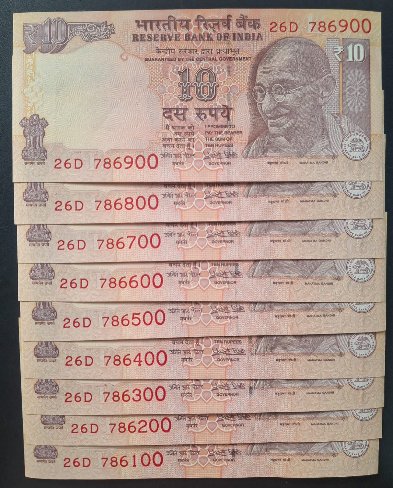 786100 – 786900 ( 9 PCS SET) 10 RUPEES GOVERNOR URJIT PATEL GEM UNC SAME PREFIX RARE ( 9 NOTE SET)