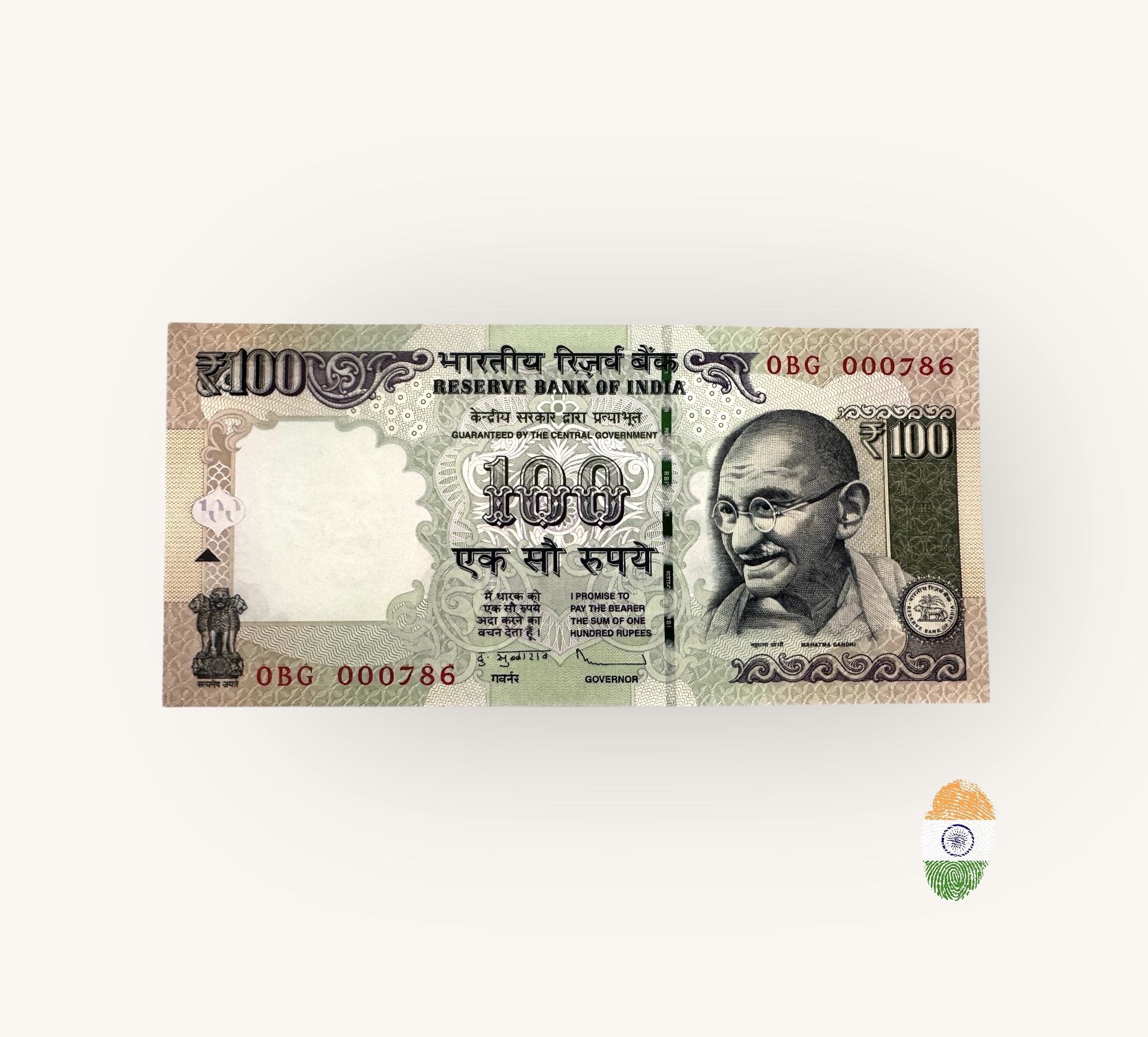 Rs 100 India Banknote Holy Fancy Number Set 0BG 000786 Small Font Subharao Inset Plain 2011 Issue Unique and Rare