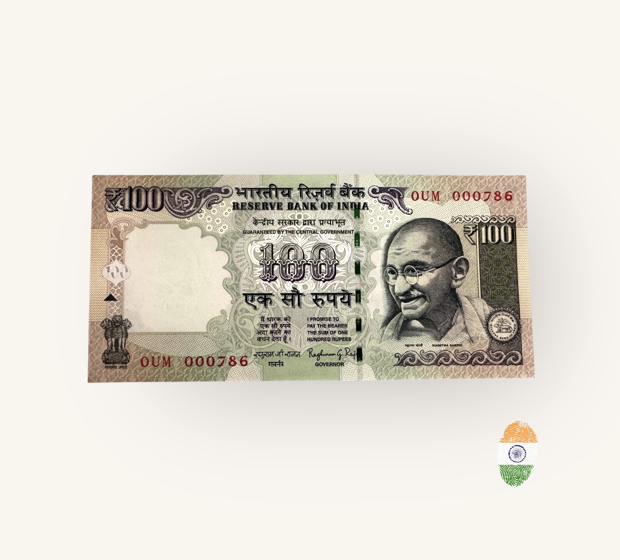 Rs 100 India Banknote Holy Fancy Number Set 0UM 000786 Small Font Raghuram Rajan Inset Plain 2016 Issue Unique and Rare