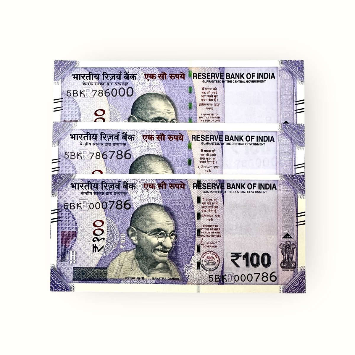 Rs 100 India Banknote Same Prefix Extreme Rare Issue Holy Number 5BK 786000 786786 And 000786 Gem Unc Unique and Rare