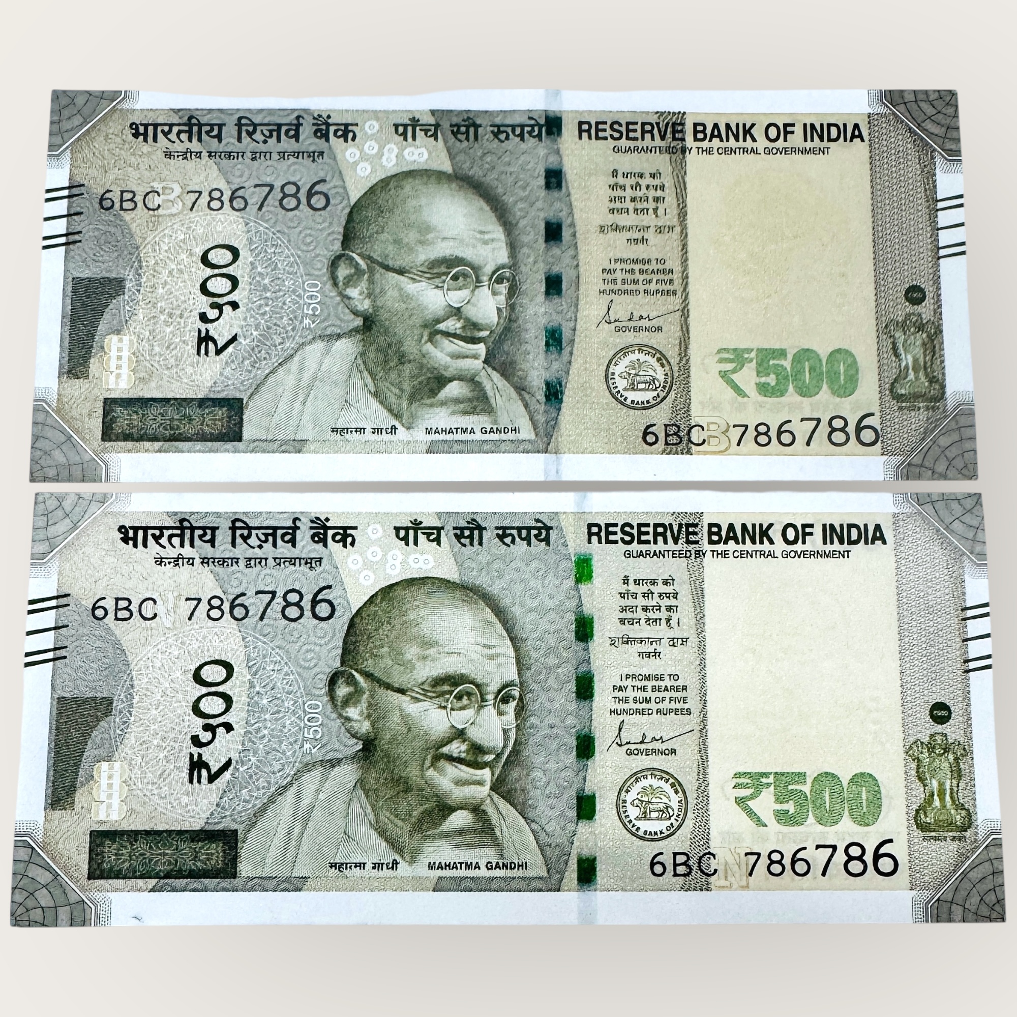 Rs 500 India Banknote Twin Set Gem Unc Very Unique Holy Number 6BC 786786 Unc Unique and Rare