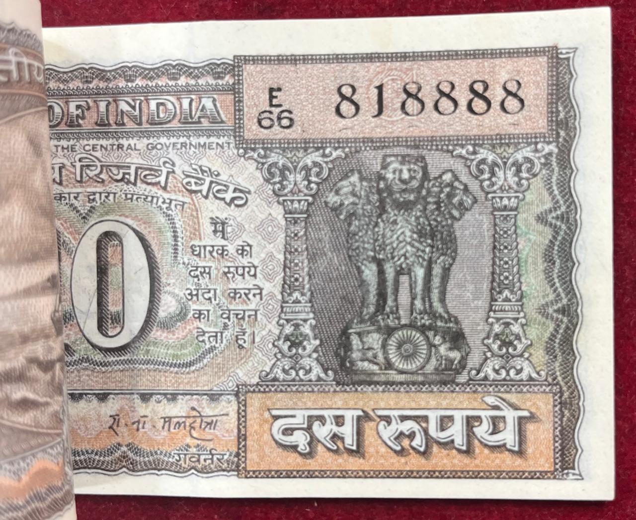 RARE 10 RUPEES GOVERNOR R.N MOLHOTRA SERIAL PACKET GEM UNC WITH FANCY NUMBER 818888