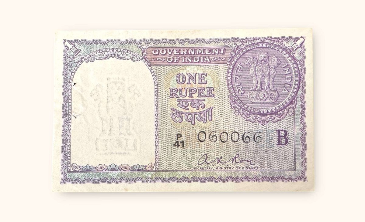 Re 1 Vintage India Bank Signed By AK Roy Issue Fancy Serial Number 060066 Unique and Rare